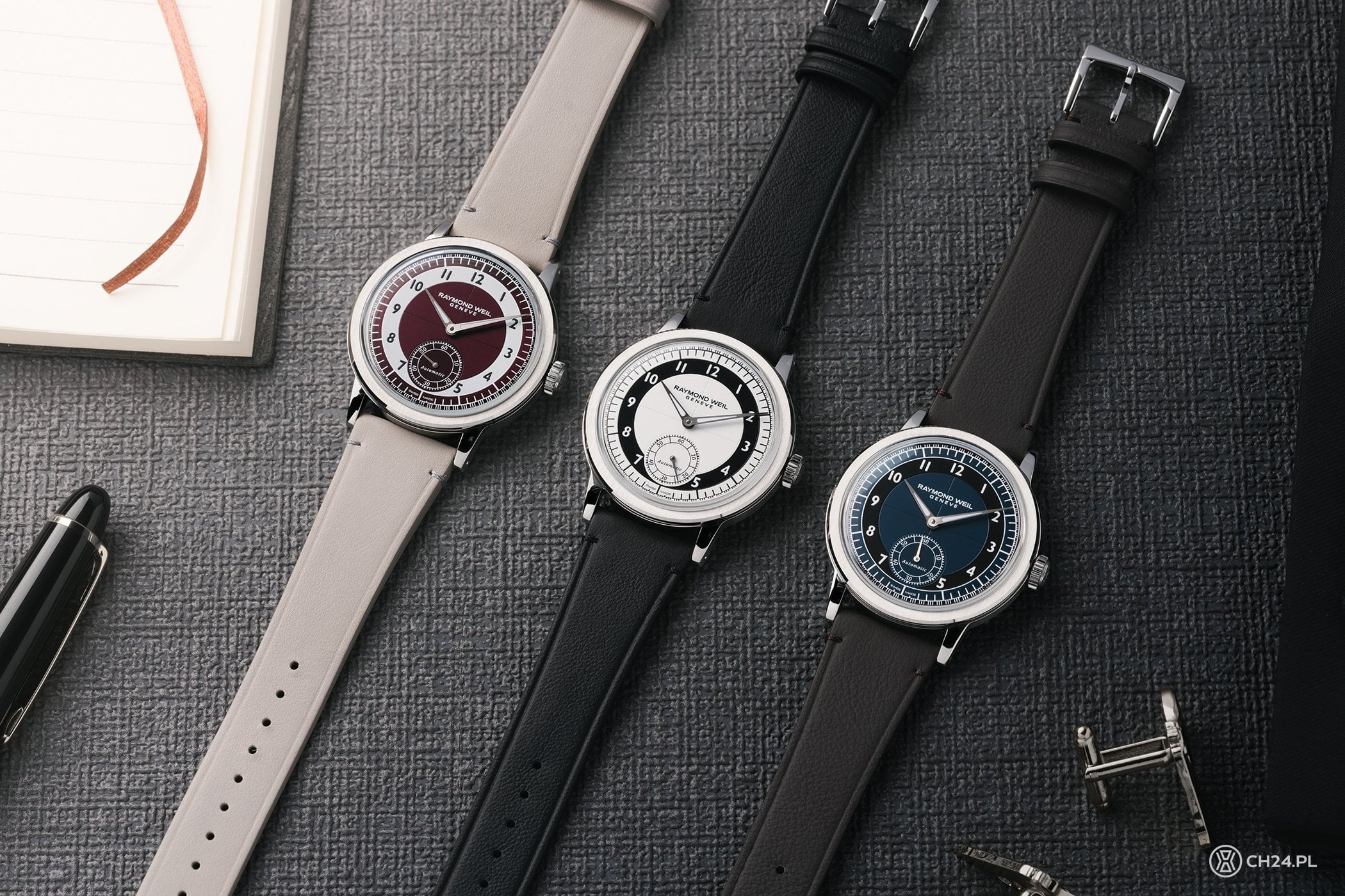 Kompaktowa koperta z wypukłym szkłem i dwukolorowa, sektorowa tarcza. Eleganckie trio z serii Millesime Small Seconds Tuxedo powstało z okazji jubileuszu marki Raymond Weil.
