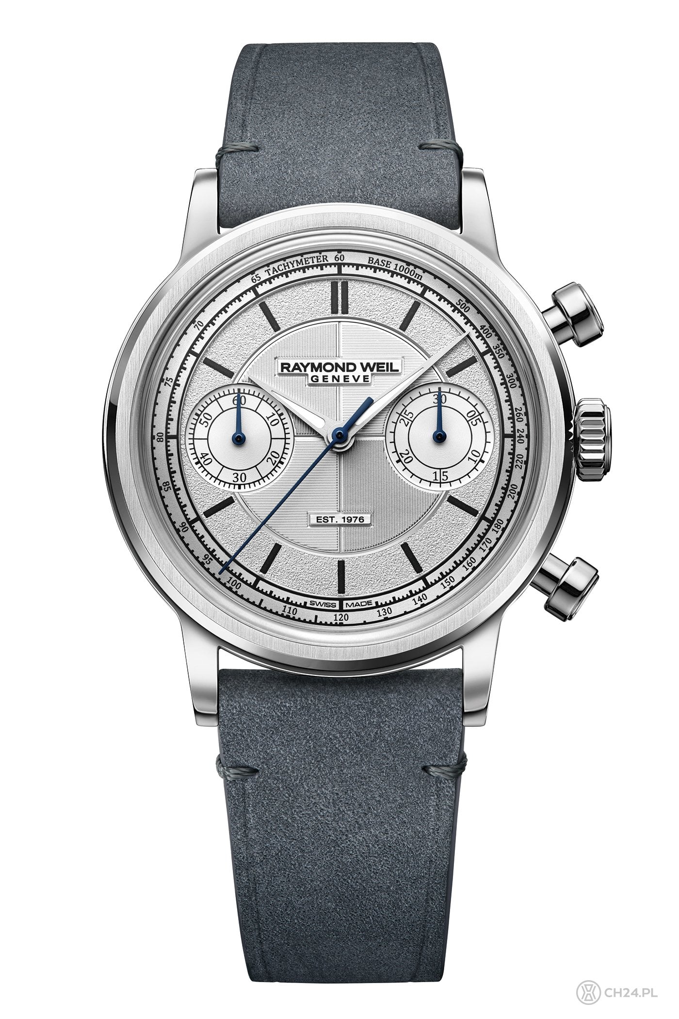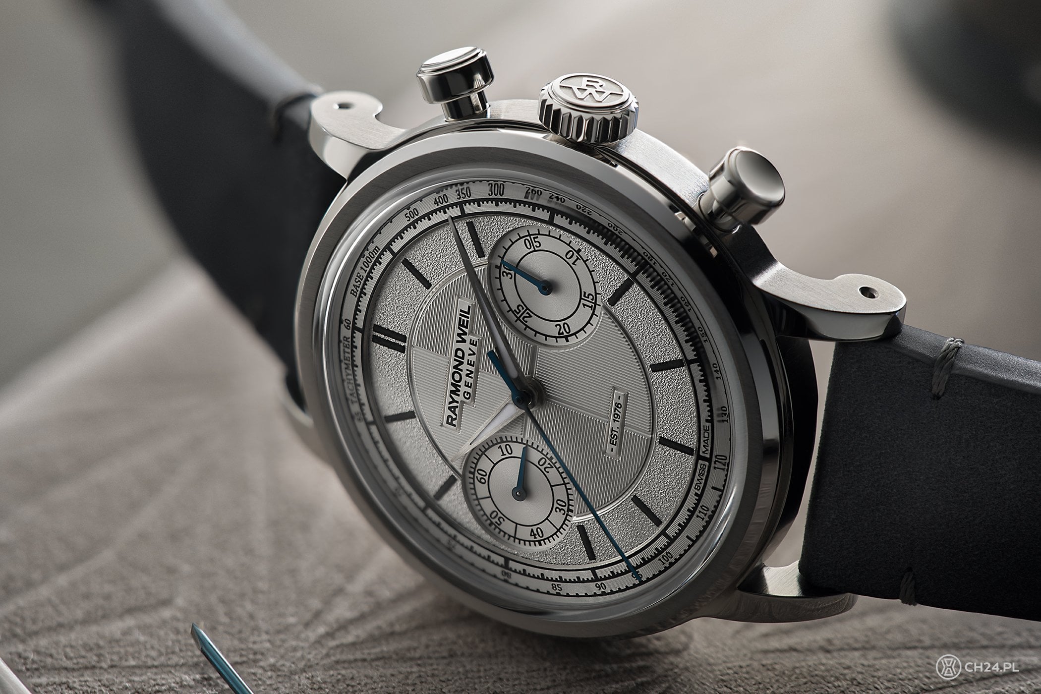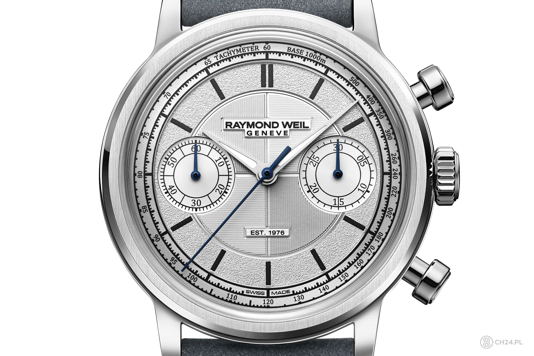 Natomiast sąsiadujący z nimi pierścień, na którym znajdują się indeksy godzinowe (są pokryte masą świecącą i w ciemności świecą na zielono) ma ziarnistą powierzchnię. Z kolei środkowa część cyferblatu została ozdobiona giloszowanym wzorem: każdą z czterech ćwiartek dekoruje godron w postaci pionowych lub poziomych żłobień, na których umieszczono dwie plakietki (u góry jest ta z napisem „Raymond Weil Geneve”, a na dole z napisem „Est.1976”). Klasyczny wygląd podkreślają też trzy niebieskie wskazówki: sekundowa i minutowa stopera oraz ta obsługująca mały sekundnik.