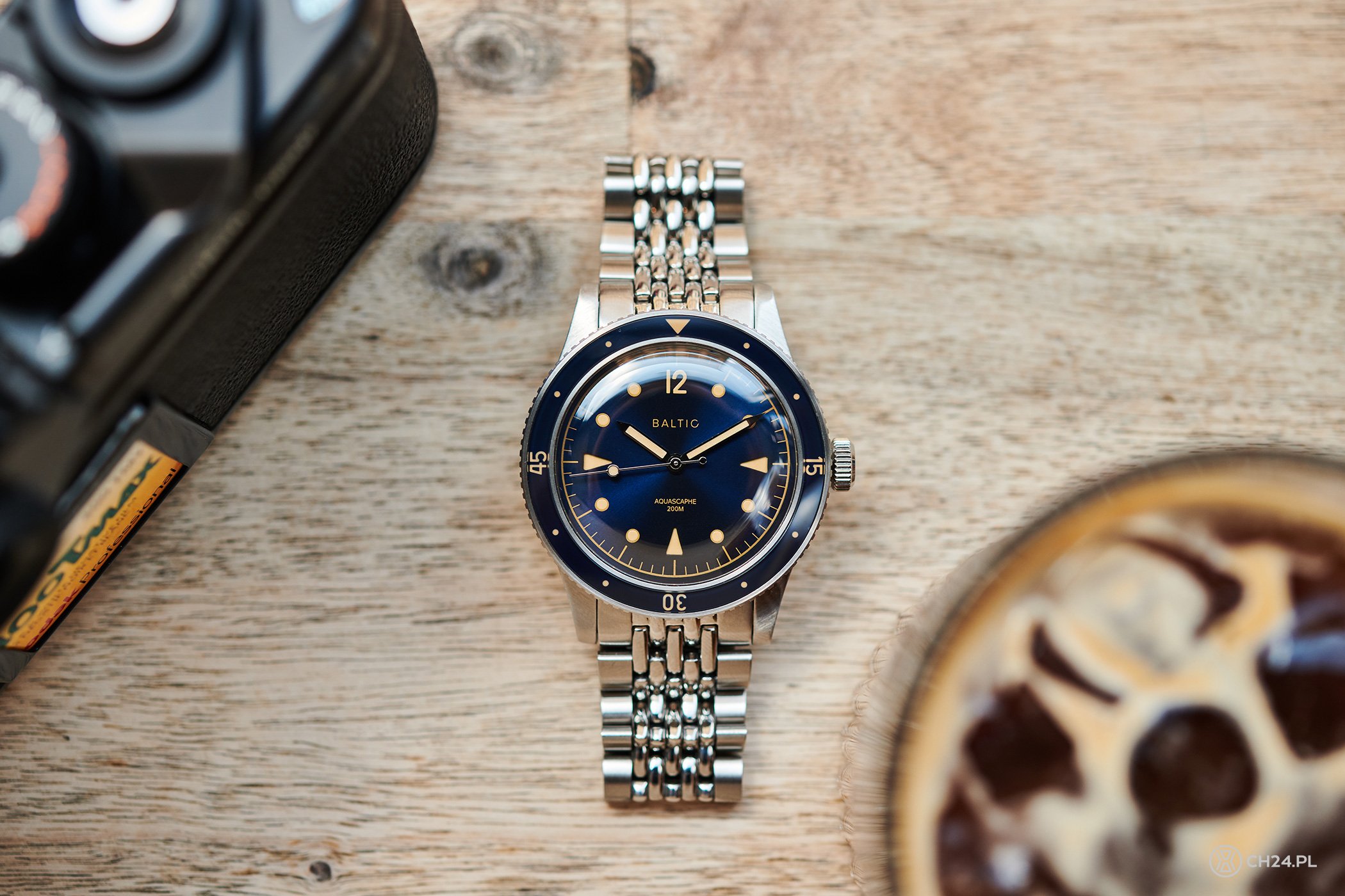 Choć Aquascaphe nie kopiuje niczego z historii, nawiązuje do niej w niemal wszystkich elementach, razem tworząc bardzo spójne, smaczne danie. Przyprawione dużą szczyptą klimatu vintage w najlepszym guście, a’la oryginalne referencje Submarinerów albo GMT Masterów, zarówno w kwestii estetycznej jak i użytkowej. Aquascaphe ma zbliżoną do pierwszych modeli Baltica, 39 mm kopertę ze szczotkowanej starannie stali. Po jej prawej stronie zamocowana została zakręcana, duża koronka bez osłony, sygnowana dużą literą „B” – coś w typie „big crown” z historycznych referencji. Od spodu kopertę zamyka pełny dekiel z ładnie wygrawerowanym wizerunkiem nurka na pofalowanym tle. W rezultacie całość jest wodoszczelna do 200 m. Z góry natomiast plastikowe szkiełko z pleksi zastąpił wypukły szafir, osadzony w nader starannie (jak na tę półkę) wykonanym bezelu. Jak na nurka przystało, bezel obraca się w jedną stronę, ma 120 klików i wkładkę z szafirowego szkła, wyskalowaną co 5 minut. Skala pociągnięta jest luminową i w ciemności świeci na zielono – podobnie jak malowane tym samym materiałem aplikacje na tarczy.