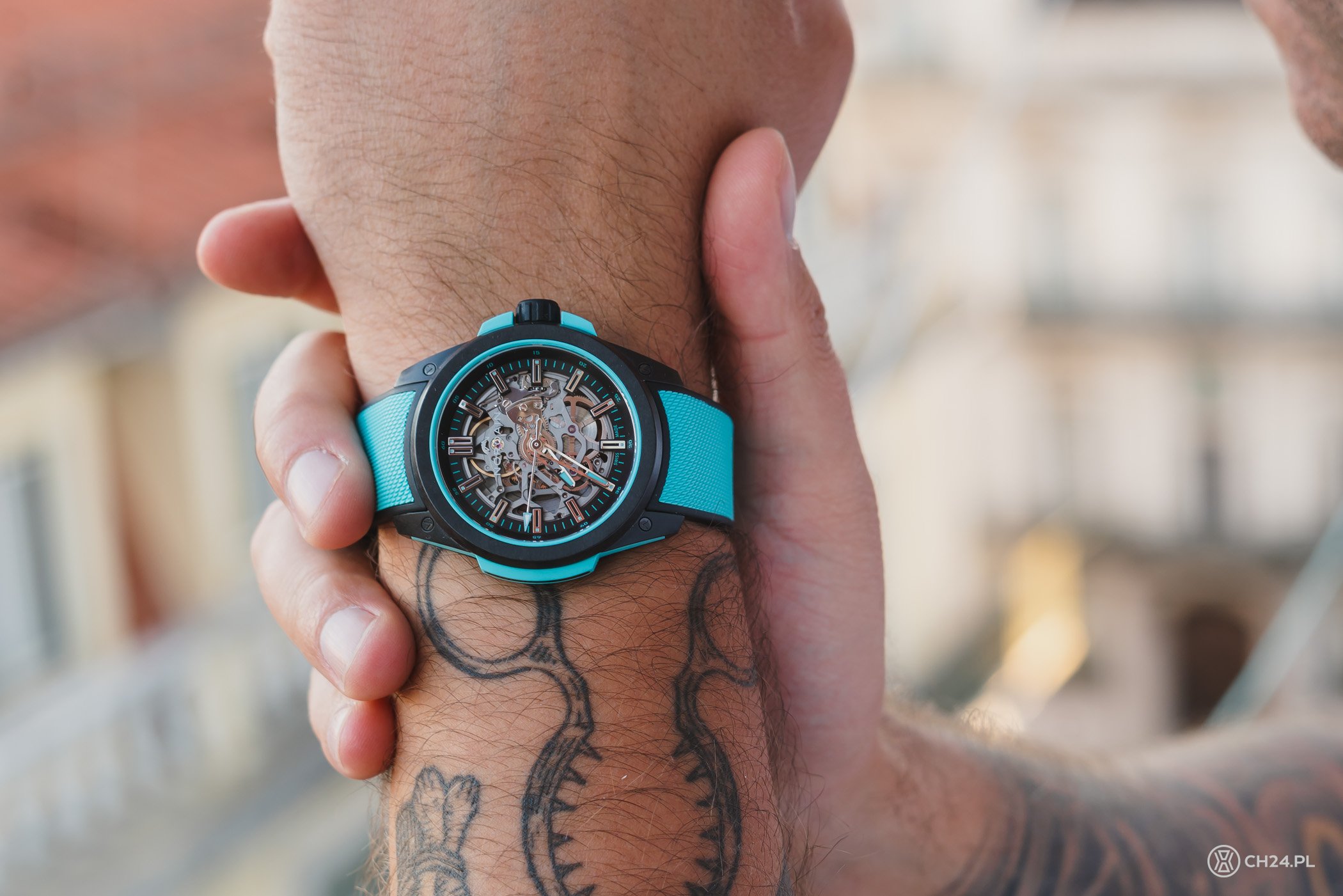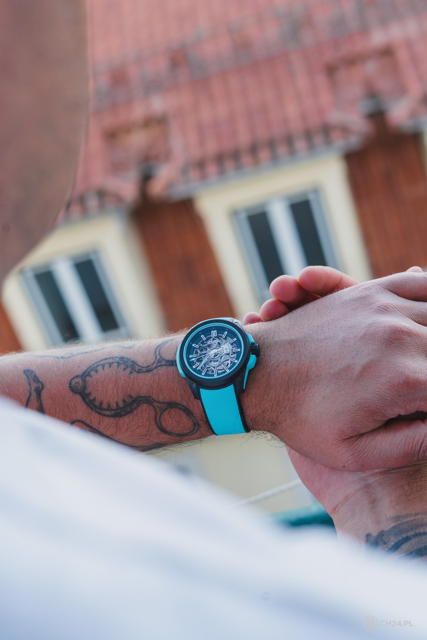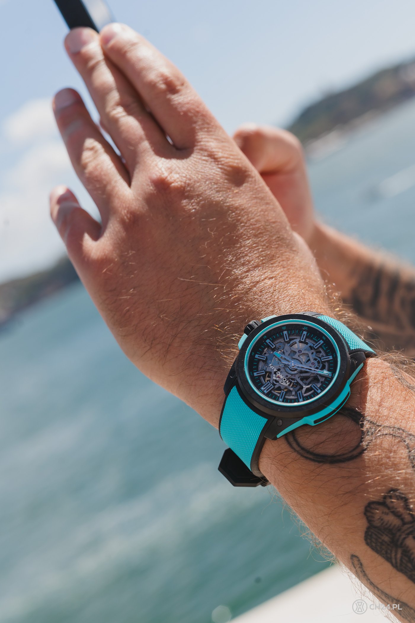 Nawet przy lug-to-lug na poziomie niespełna 50 mm Wild One nosi się świetnie, co oczywiście w dużym stopniu przypisać wypada wadze. Ta jest istotnie piórkowa, bo poza Norteqiem, obudowę zmontowano z gumy oraz tytanu. Tytanowy jest wewnętrzny rdzeń, w którym montowano mechanizm oraz tarczę. Guma zaś pełni rolę elementu antywstrząsowego i zabezpieczającego oraz umożliwia opcje kolorowania zegarka na praktycznie dowolną barwę. Wild One oferowane jest więc w całej ich palecie, a wersja Skeleton to m.in. jaskrawy pomarańcz „Coral”, seledynowa zieleń „Gecko”, pastelowy niebieski „Sky Blue” czy wreszcie fiolet. Najlepiej jednak wypada turkusowo-niebieska opcja „Turquoise”.