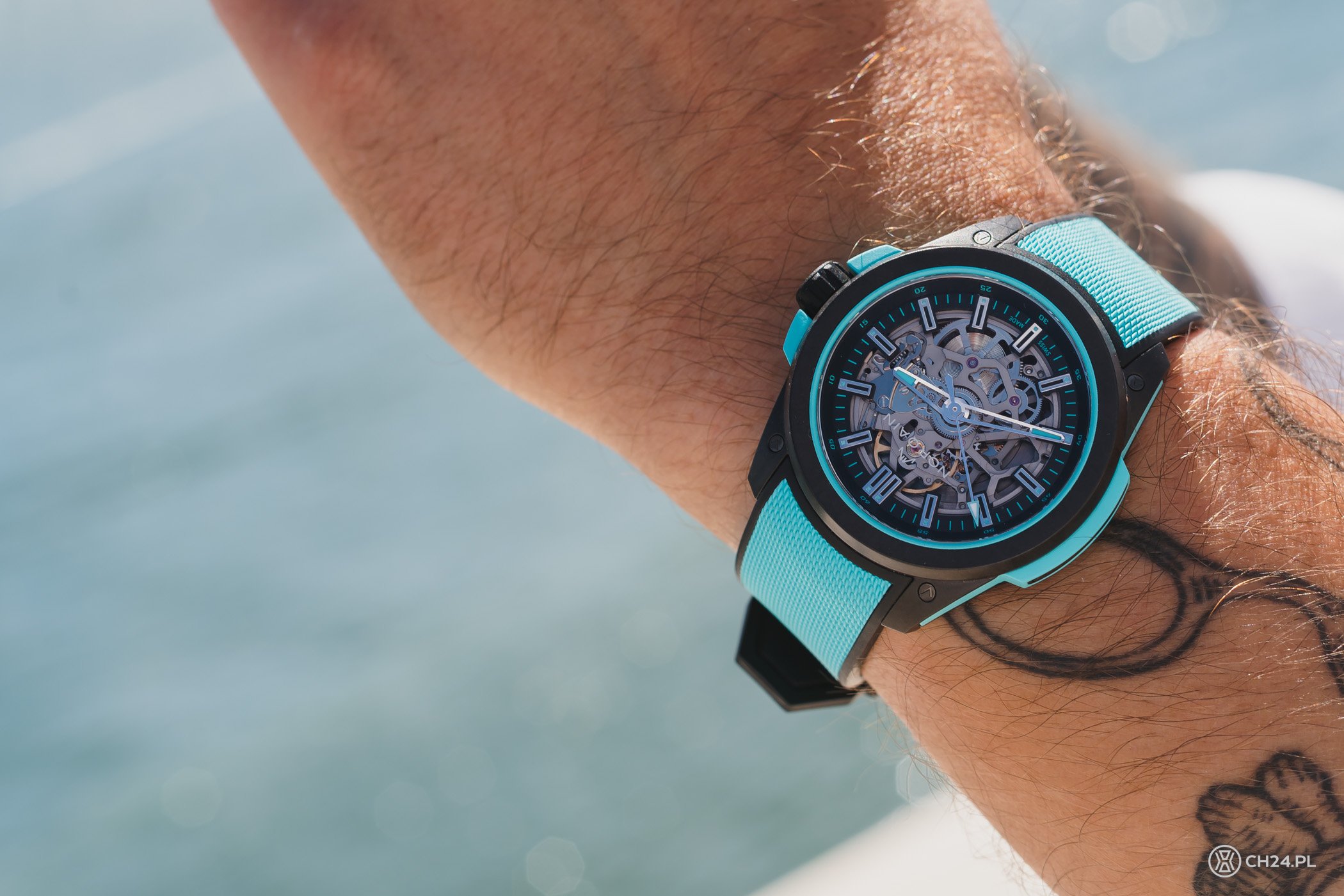 Jeśli zgodzicie się ze mną, że letni zegarek na wakacje powinien być niewymagający, maksymalnie komfortowy i bezproblemowy – szkieletowany Wild One spełnia wszystkie te kryteria znakomicie. Spora, mierząca 42 mm średnicy i 12,3 mm grubości na papierze (tym wirtualnym) może wydaje się duża, ale w praktyce wypada zaskakująco kompaktowo i wygodnie – a nadgarstka przesadnie dużego nie posiadam. Dla posiadaczy mniejszych nadgarstków stworzono również wariant 39 mm.