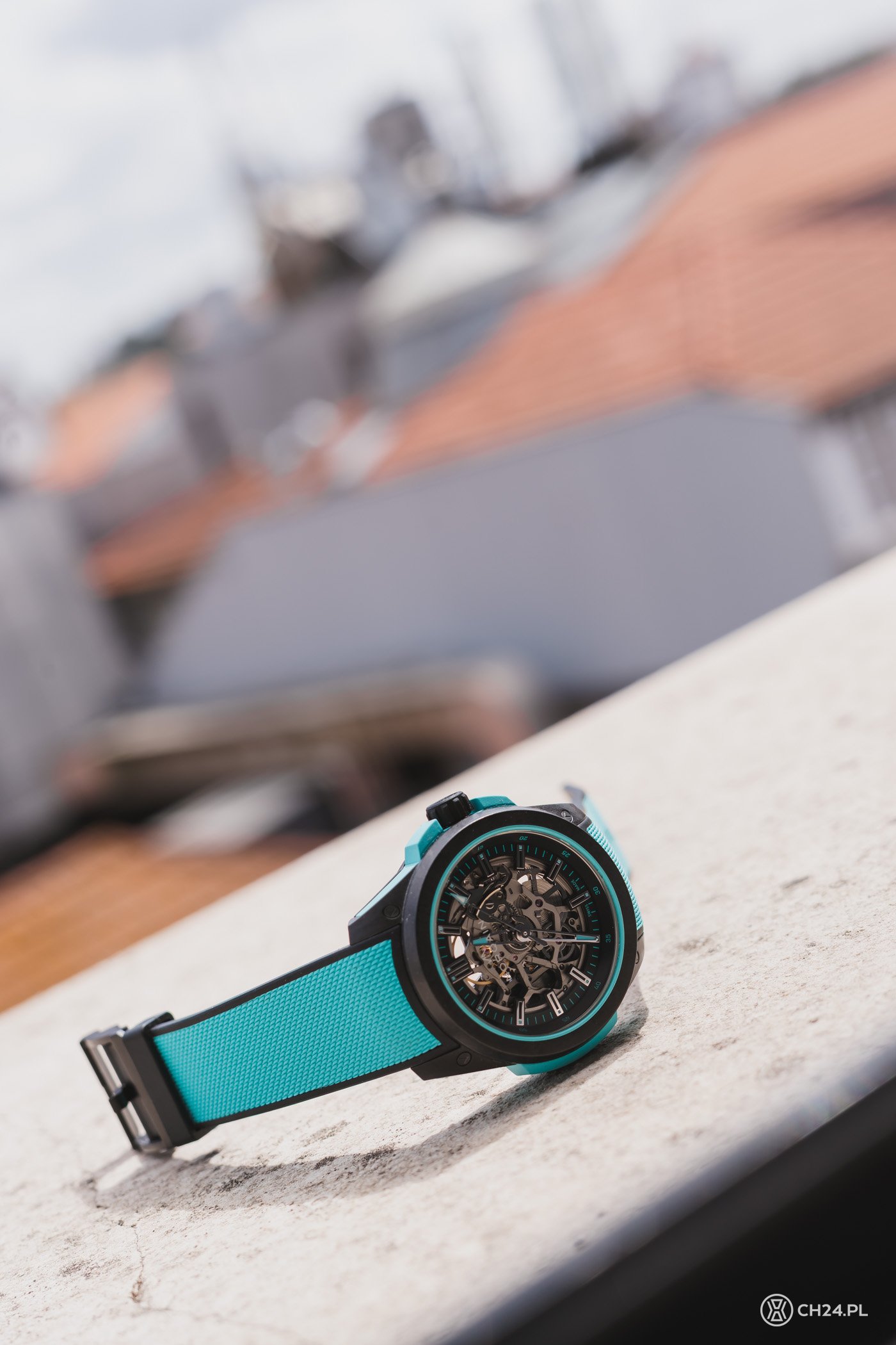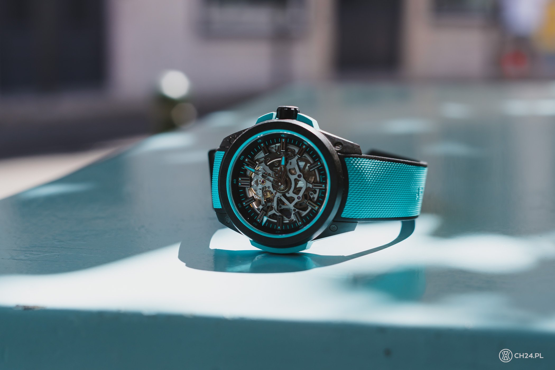 Choć może design modelu Wilde One Skeleton nie jest żadną rewolucją i nie wymyśla koła na nowo, jest na tyle oryginalny, a przy tym spójny, że zapisuje kolejny plus w ocenie. Oczywiście ten element zegarka zawsze jest subiektywny, ale czerń karbonu, jaskrawo turkusowe akcenty i wreszcie szkieletowany cyferblat (i mechanizm) współgrają ze sobą znakomicie, tworząc bardzo estetyczny, współczesny produkt.