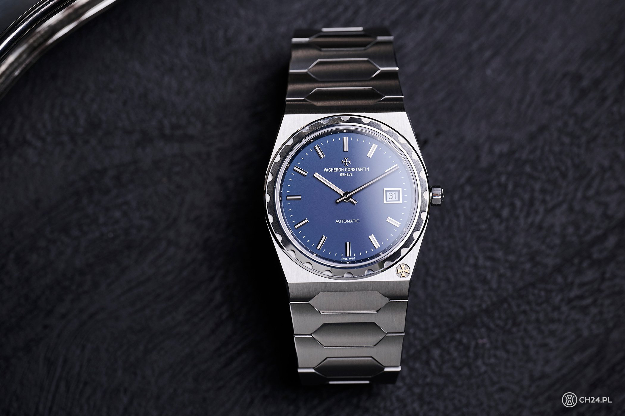 Odcień cyferblatu oraz jego projekt pozwolił Vacheronowi osiągnąć ciekawy efekt vintage bez typowych zabiegów sztucznego postarzania całości. Kolor niebieskiego jest lekko szary, pastelowy, nieco wypłowiały, ale jednocześnie głęboki i nasycony – zmieniający się nieco wraz z padającym światłem. Wśród palety barw niestandardowych, niebieski cieszy się w zegarkach pewnie największą popularnością, ale w odcieniu użytym przez VC pojawia się raczej rzadko. A szkoda, bo to chyba najładniejsza niebieska tonacja, jaką widziałem na zegarkowej tarczy. Dodatkowo nie jest niepotrzebnie zdobiona żadnymi szlifami, a jedynie lekko chropowata dla podbicia matowego efektu.