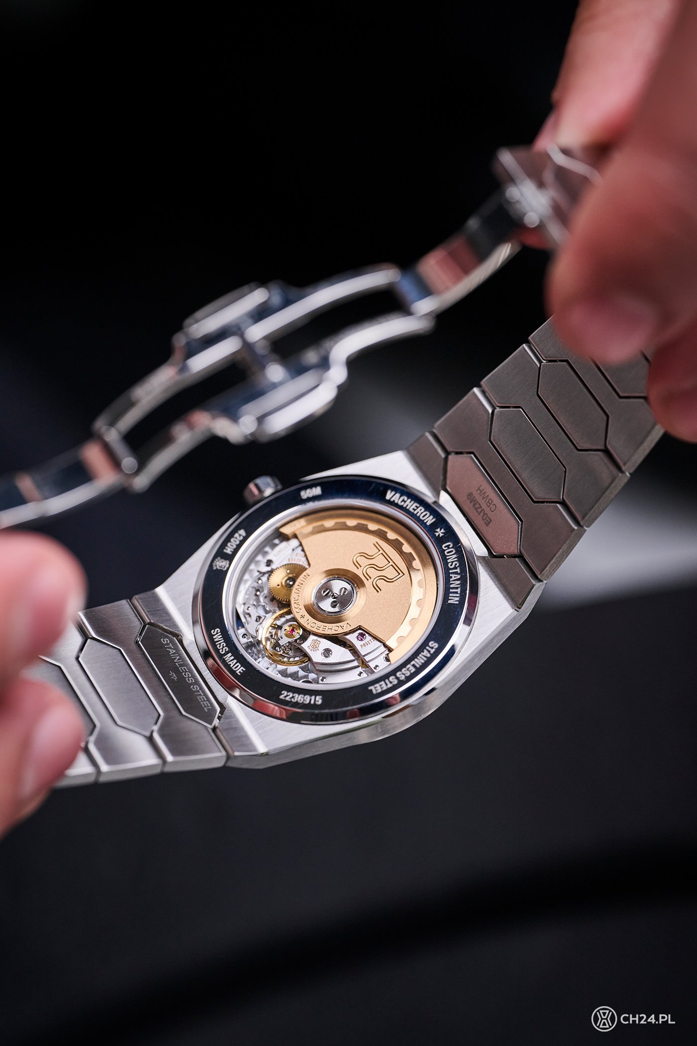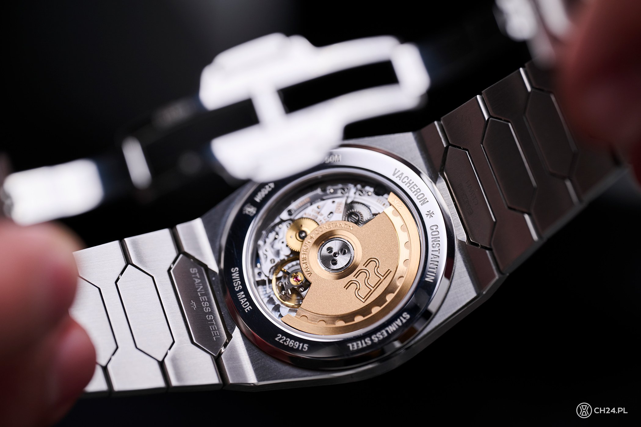 Druga strona koperty również zamknięta jest szafirowym szkłem, które oferuje widok na pracujący w zegarku kaliber 2455/2. Manufakturowa konstrukcja VC dysponuje raczej skromną, 40-godzinną rezerwą chodu, którą generuje wykonany z 22 ct złota wahnik automatycznego naciągu, ozdobiony motywem geometrycznym z bezela oraz wytłoczonym na środku „222”. Taktowany na 4 Hz kaliber ma 3,6 mm grubości i opatrzony jest Pieczęcią Genewską – a to oznaka nie tylko wyśrubowanych parametrów technicznych, ale i estetyki. 2455/2 ozdobiony jest więc bogato, od pasów genewskich począwszy, przez polerowanie rantów, perłowanie i polerowane śrubki. Symbol pieczęci wygrawerowano na mostku koła balansowego.