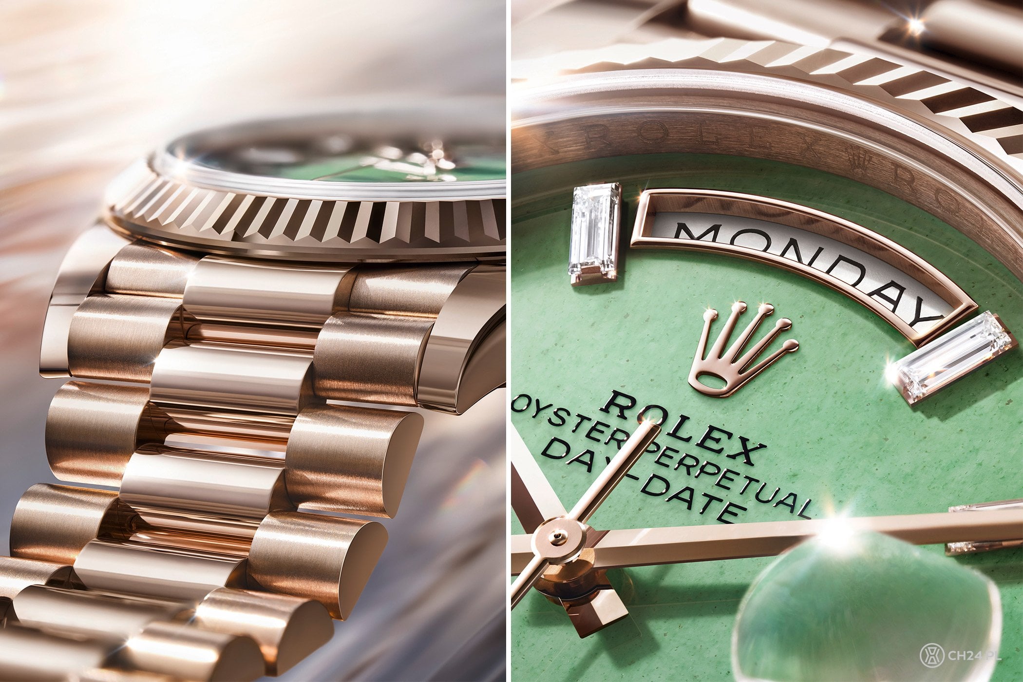 Nowy Day-Date łączy autorski stop złota Jubilee, opracowany i produkowany przez Rolexa, z modną tarczą z naturalnego kamienia – w tym przypadku z zielonego awenturynu.
