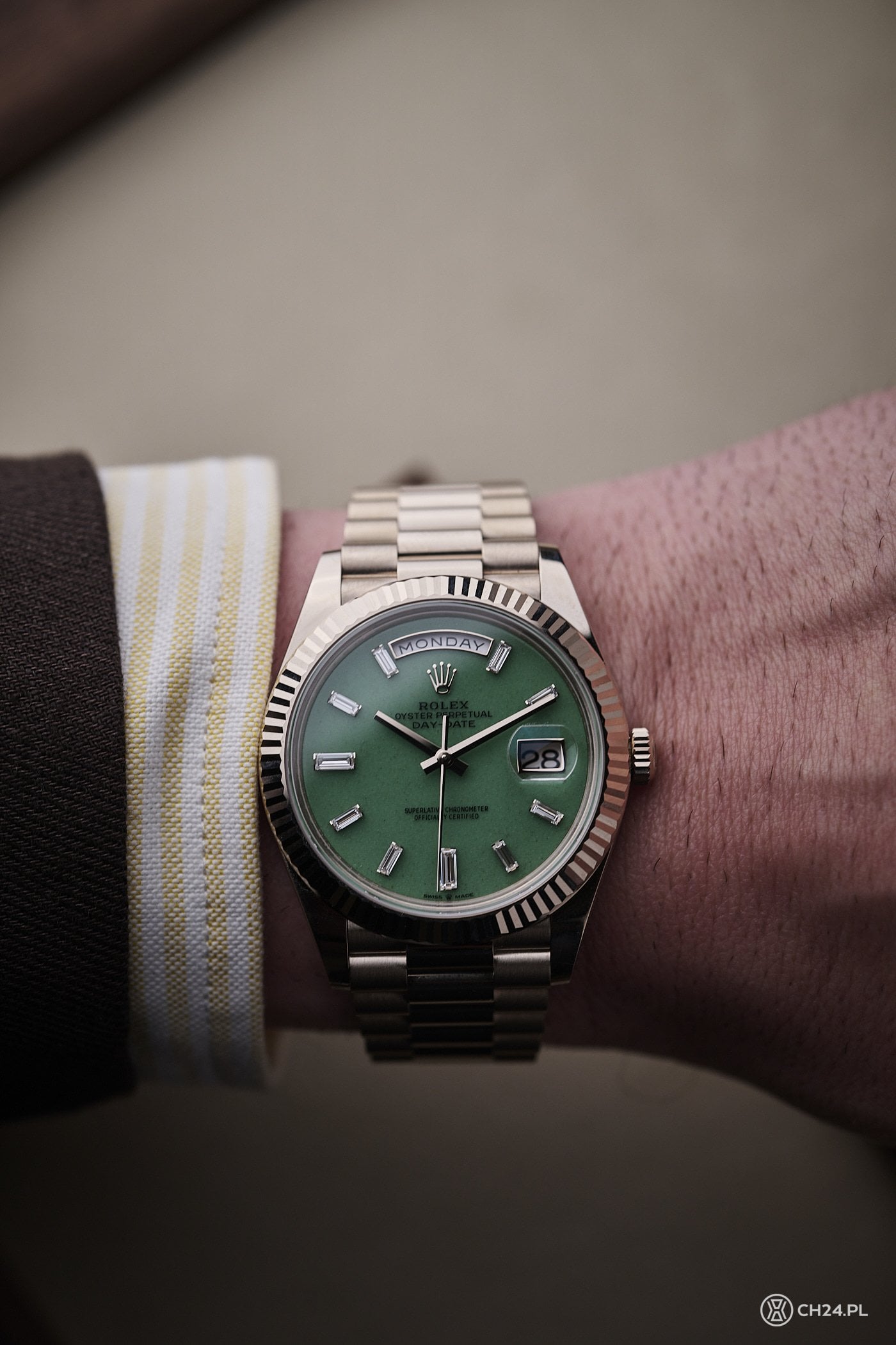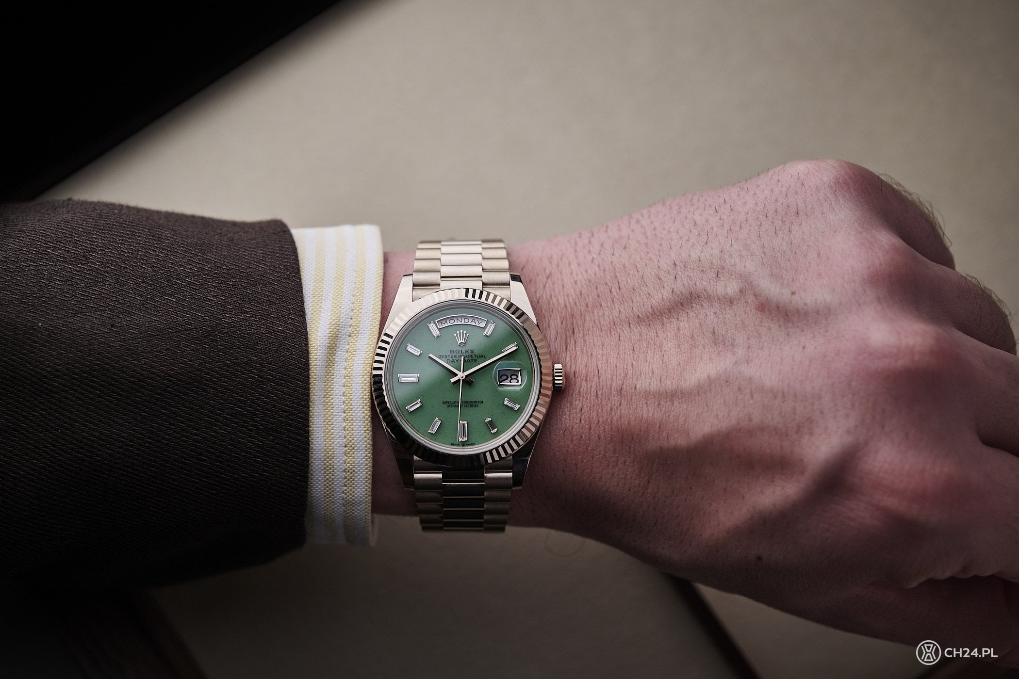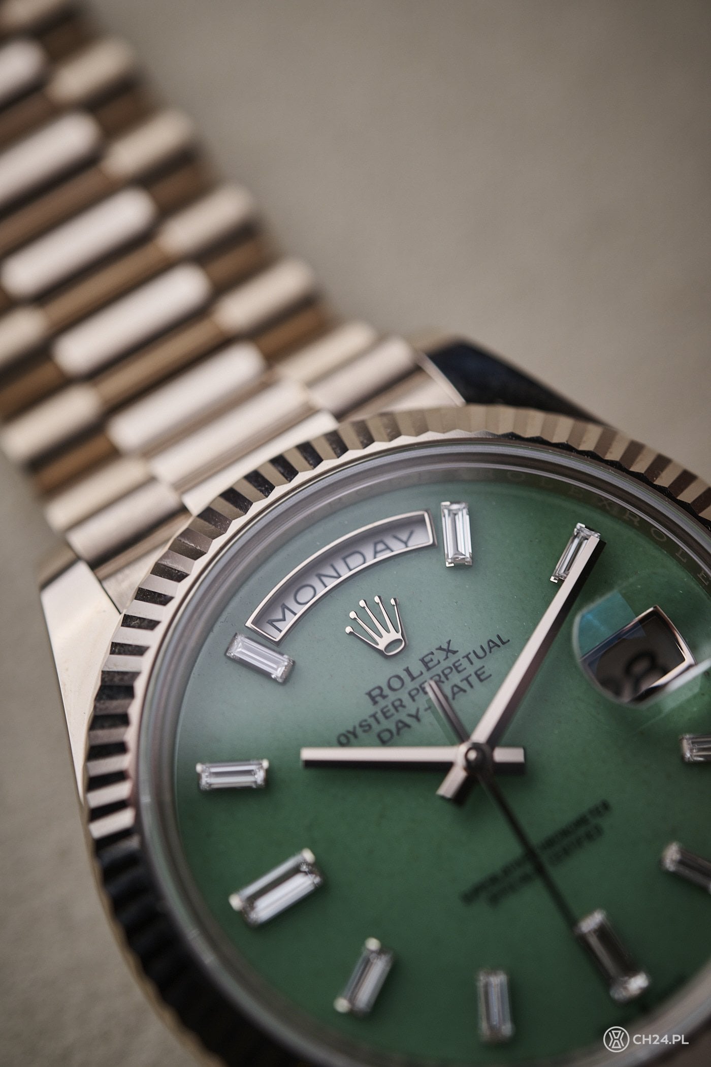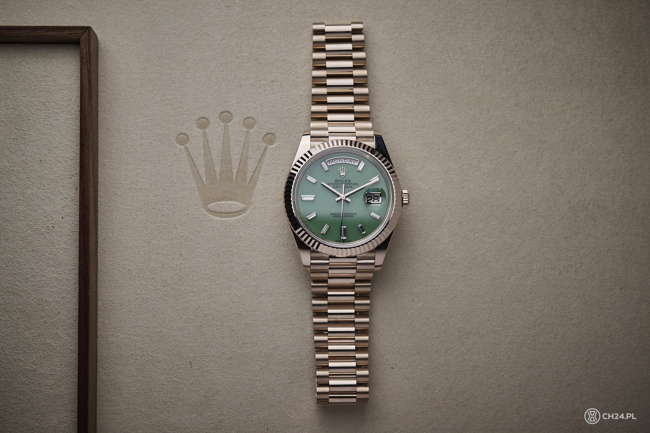 Nowy Day-Date otrzymał 40 mm kopertę o grubości 12 mm i klasie wodoszczelności 100 metrów. We wspomnianym rozmiarze zadebiutował ponad dekadę temu, wraz z kalibrem 3255, który do dzisiaj zasila ten model. Zegarek zestawiono z bransoletą President, zbudowaną z trzech półokrągłych ogniw (środkowe są polerowane na wysoki połysk), która zwęża się i kończy estetycznym zapięciem Crownclasp. Przypomnę, że Rolex wykorzystuje w nim elementy z ceramiki, zwiększające żywotność oraz elastyczność.