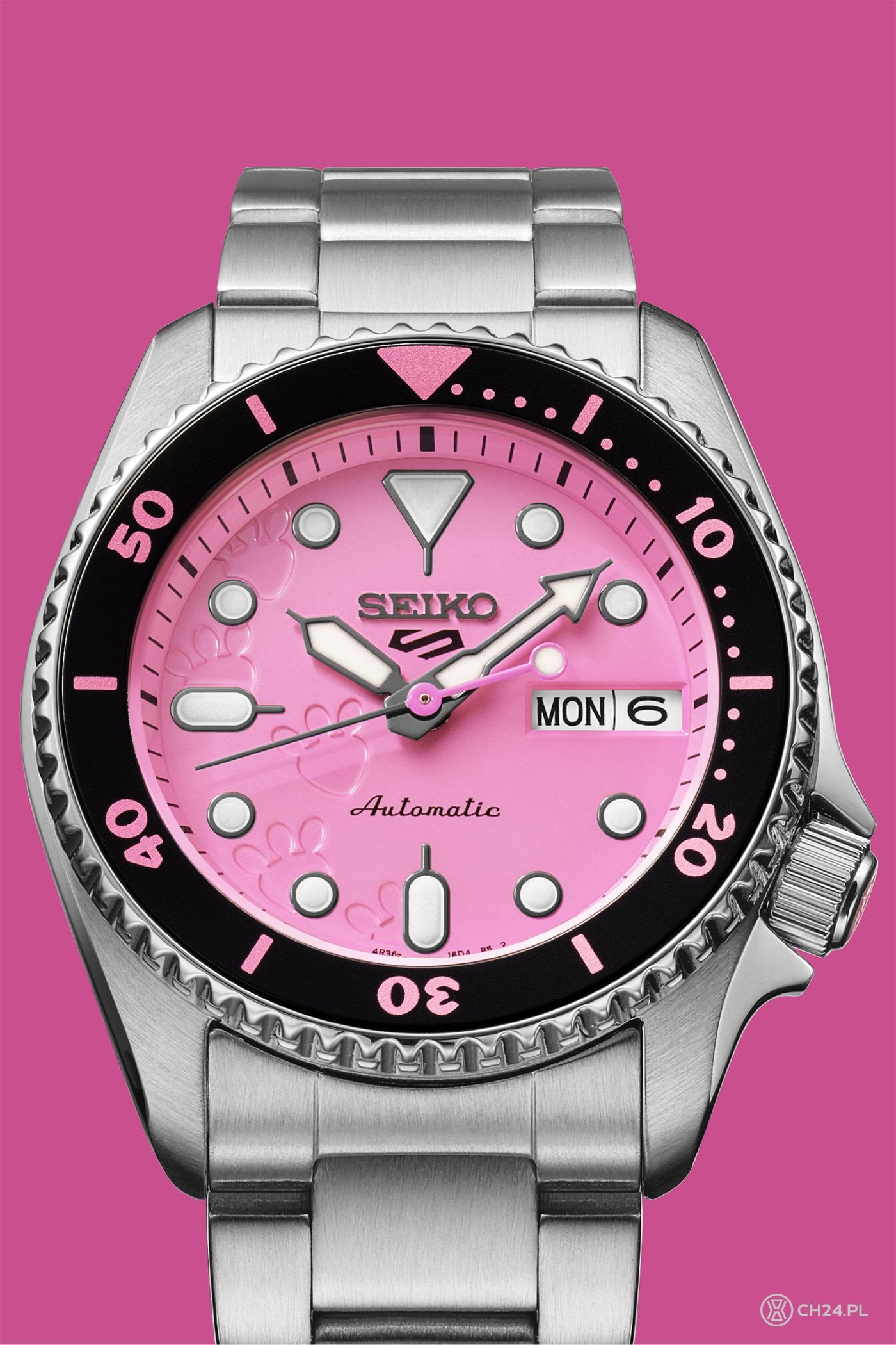 Kompaktowa koperta, dominujący róż i odciśnięte ślady stóp na tarczy oraz tekstylnym pasku. A od strony dekla – spoglądająca Różowa Pantera. Taki jest, inspirowany słynną postacią z kreskówki, model 5 Sports Pink Panther Limited Edition SRPM07.