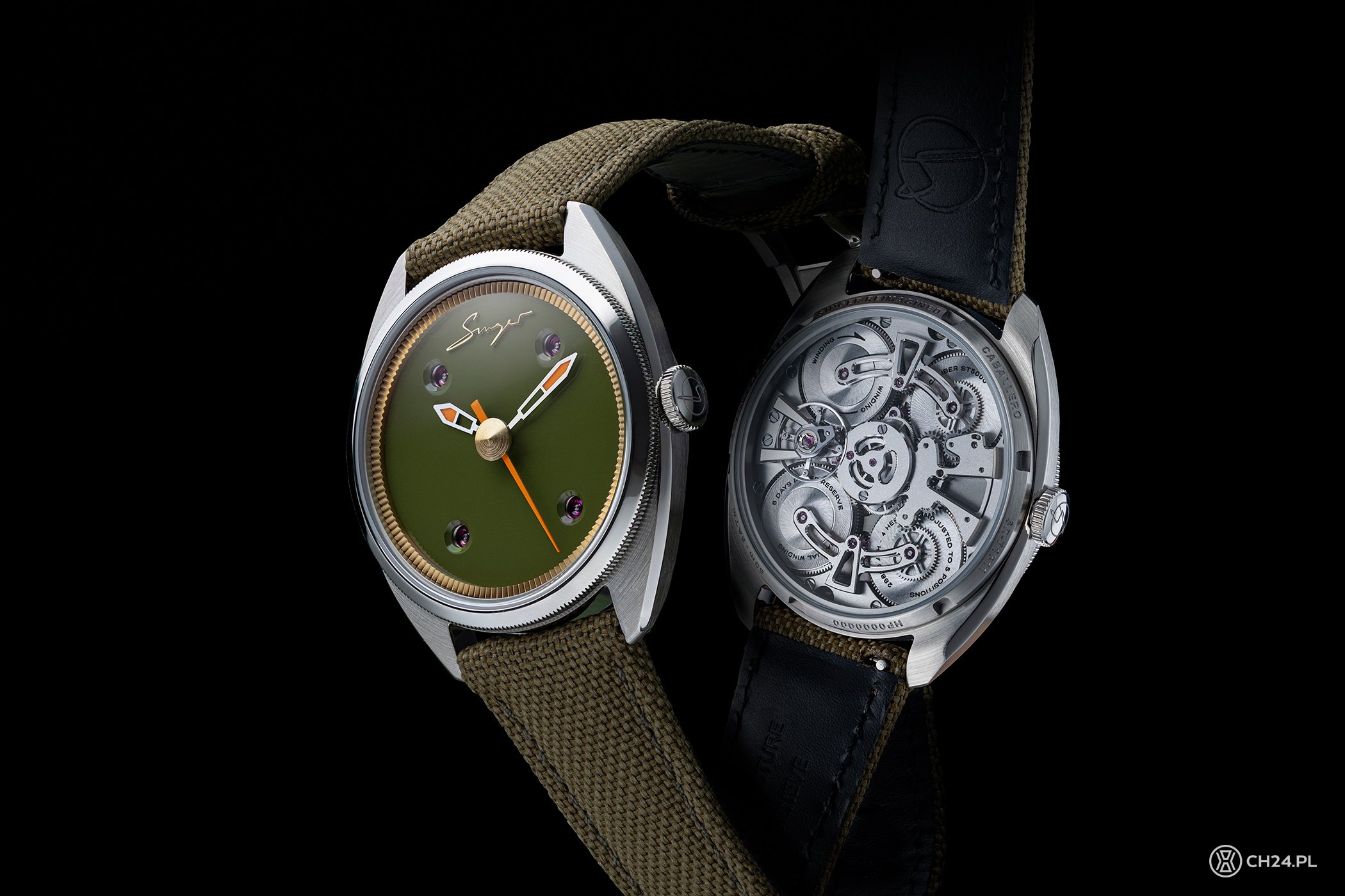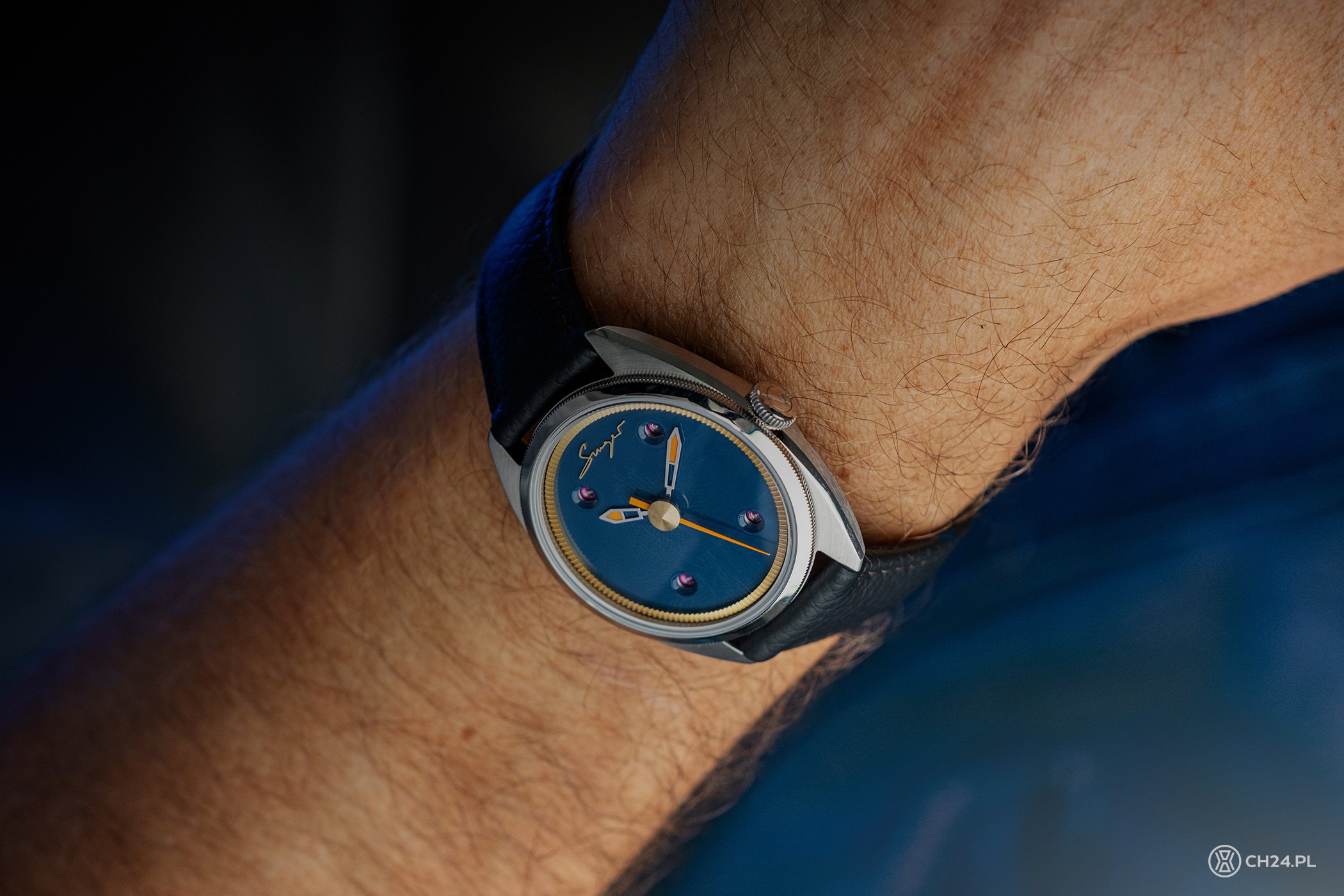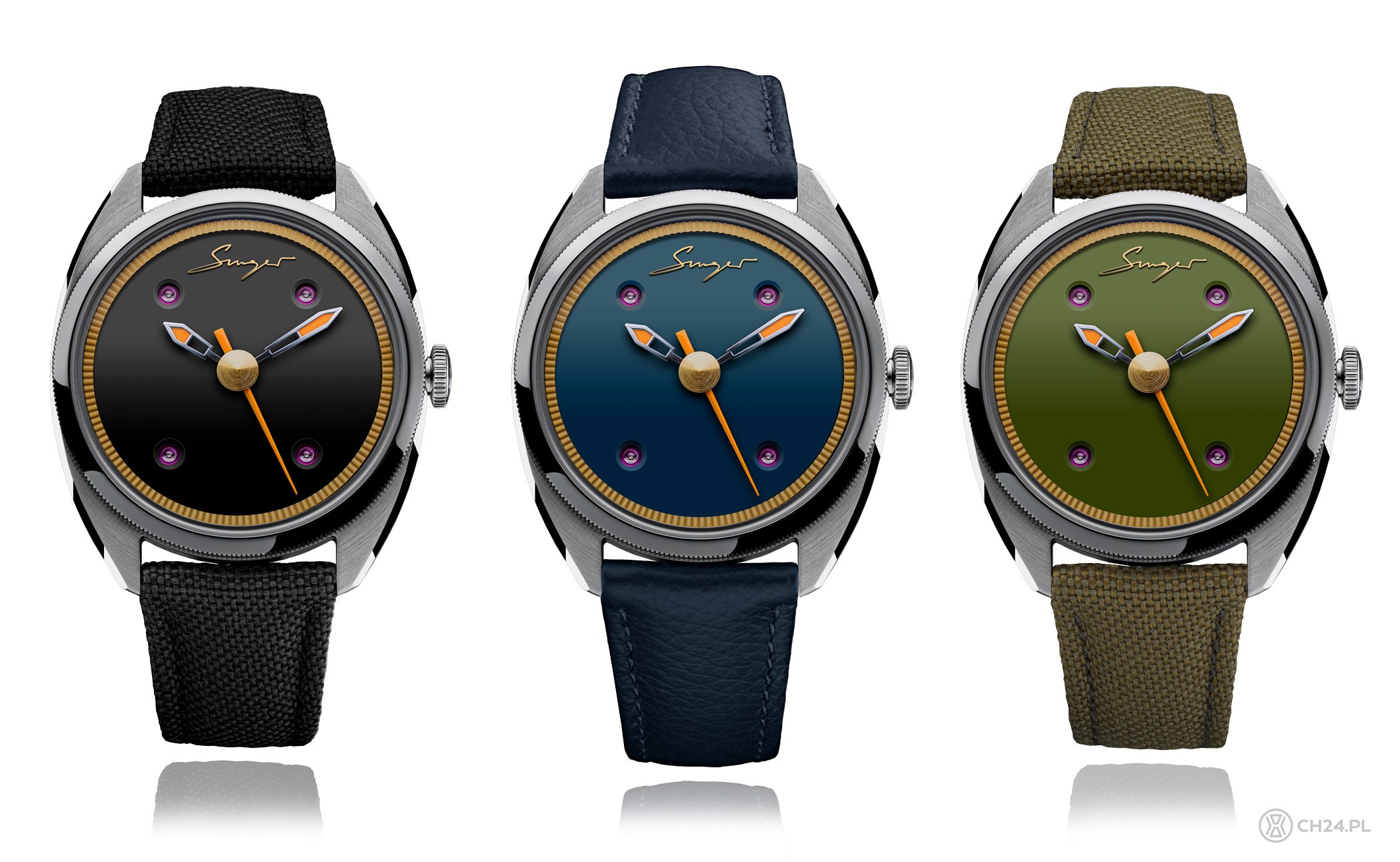 Mierząca 39 mm średnicy, beczułkowata koperta ma 10,5 mm grubości. Jej forma nawiązuje do kształtu pierwszych Singerów, ale zamiast masywności oferuje smukły profil oraz wykończenie polerkami i satynowaniem. Obudowę z obu stron zamykają szafirowe szkła. To przednie jest lekko wypukłe, osłaniające cyferblat otoczony złotym, ząbkowanym pierścieniem. Sama tarcza – do wyboru czarna (Piano Black), niebieska (Petrol Blue) albo zielona (Empire Green) – wykonana została z wielowarstwowego lakieru. Porusza się nad nią trójka charakterystycznych dla marki wskazówek z pomarańczowymi akcentami. U góry nałożono złote logo Singera, ale uwagę od razu przyciąga coś innego – cztery symetrycznie rozłożone rubinowe kamienie.
