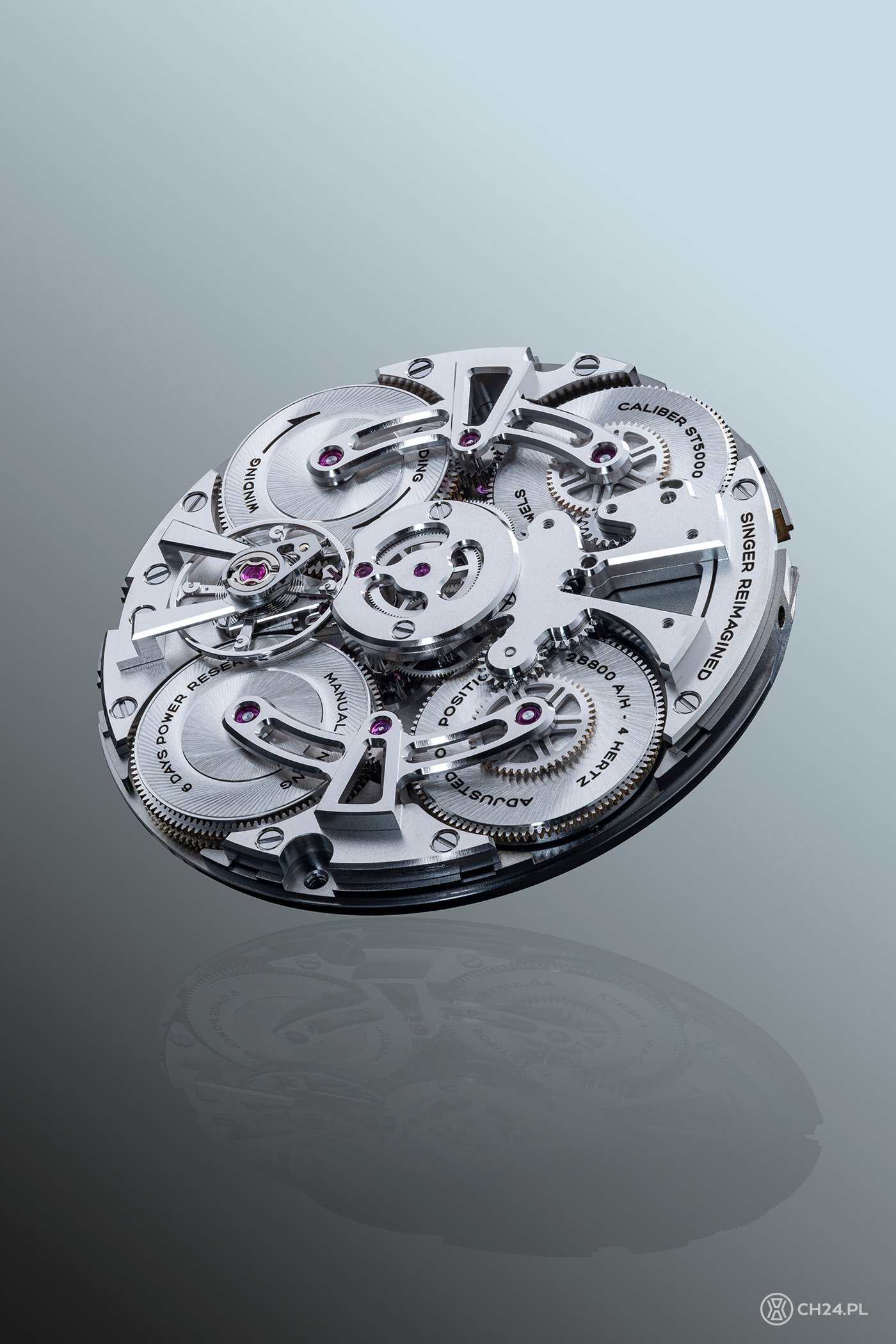 Mechaniczne serce Singera Caballero to zarazem pierwsza autorska konstrukcja marki. Nowy, manualnie nakręcany mechanizm stawia na funkcjonalność, ale z mocnym naciskiem na chronometrię i maksymalnie doskonałą dystrybucję energii. Werk ma więc aż 4 zamocowane w symetrycznym układzie bębny sprężyny (stąd cztery łożyskujące je rubiny na tarczy), które nie tylko gwarantują pełne 6 dni (144 h) rezerwy chodu, ale i równe, stałe oraz niezakłócone rozprowadzanie energii.