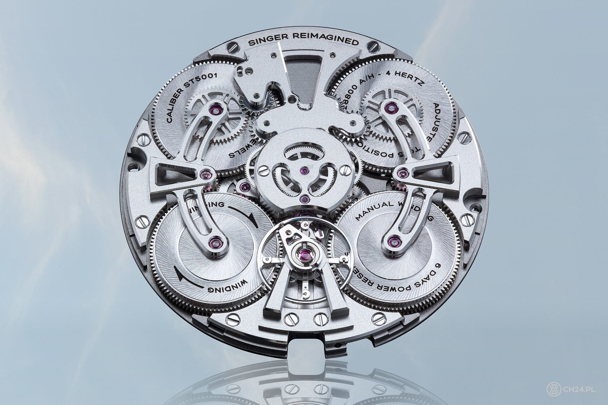 Pod przeszklony dekiel Singer montuje manualnie nakręcany kaliber ST5001. Werk ma aż 4 bębny sprężyny, pracujące ze sobą w synergii, co gwarantuje stabilny dopływ energii oraz pokaźne 144 h (pełne 6 dni) rezerwy chodu. Symetrycznie zaprojektowana konstrukcja ulokowała organ regulacyjny mechanizmu – jego wychwyt ze sporych rozmiarów kołem balansowym – precyzyjnie w dolnej części mechanizmu. Werk taktowany jest na 4 Hz.