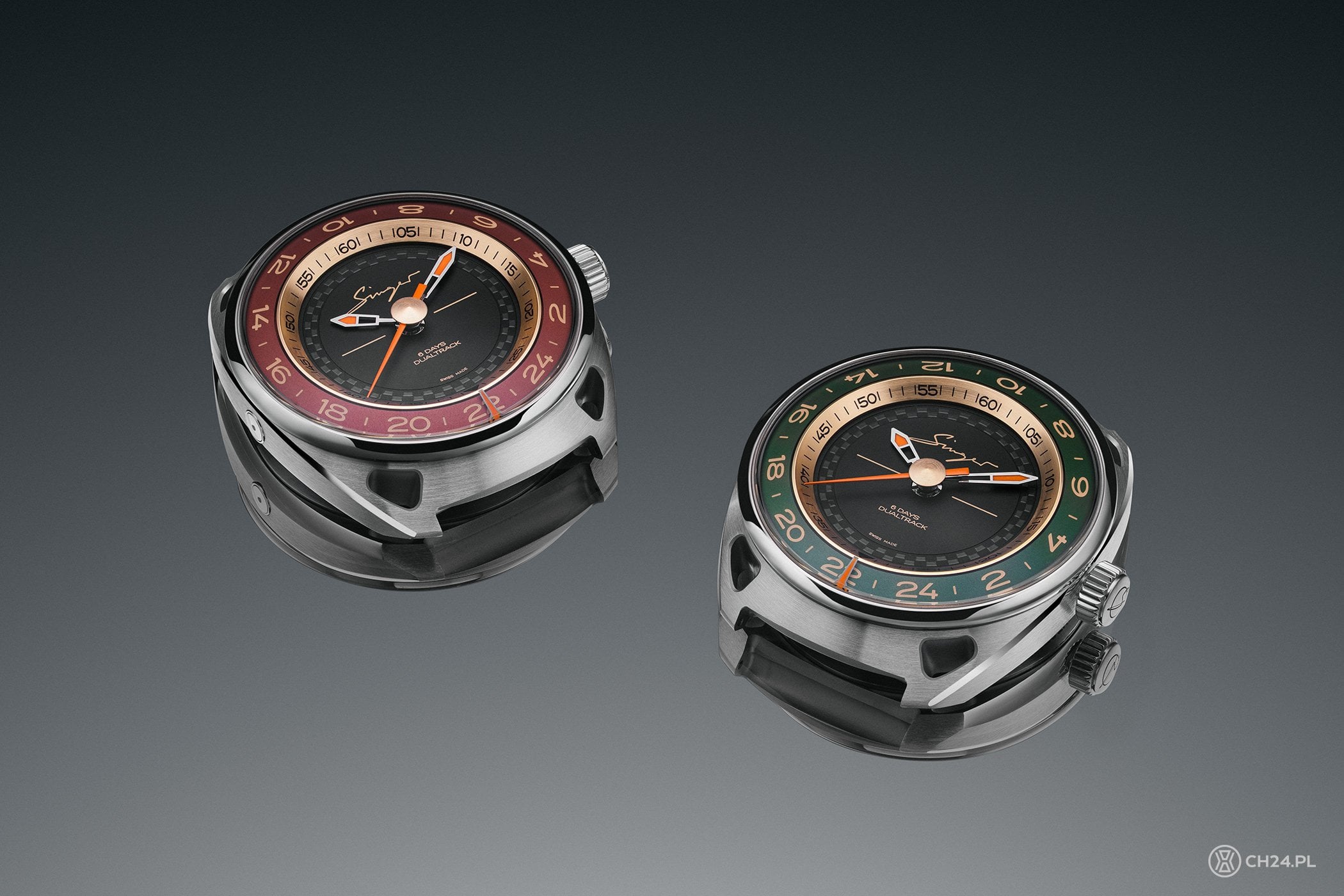 Tak jak w klasycznym, typowym zegarku z druga strefą, w nowym Singerze znajdziecie dwa wskazania czasu. Centralnie umocowane, typowo dla marki uformowane wskazówki (przypominające te z deski rozdzielczej Porsche Singer) odpowiadają za wskazanie czasu lokalnego – w miejscu, w którym się aktualnie znajdujemy. Z kolei czas w innym, dowolnie wybranym punkcie za świecie, pokazuje okalający cyferblat, uniesiony pierścień z podziałką 24-godzinną. Jak odczytać z niego właściwą wartość? O to dba pomarańczowy znacznik na wysokości godz. 6. Sam pierścień zaś może mieć kolor zielony (Meridian Green) albo czerwony (Horizon Red). Sama tarcza natomiast jest matowoczarna i otoczona czarnym ringiem z szachownicą, przypominającą dyskretnie o motoryzacyjnym DNA marki.