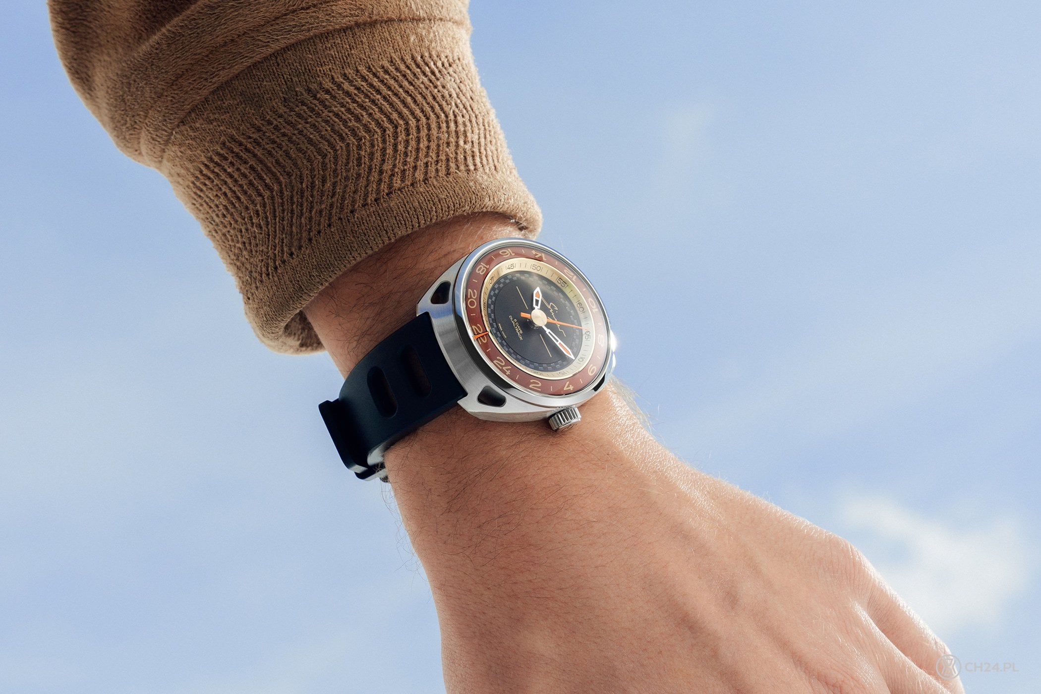 By wygodnie regulować czasem drugiej strefy, w lewym boku koperty umieszczono dyskretnie schowany przycisk, którego wciśnięcie przesuwa pierścień o jedną godzinę do przodu.