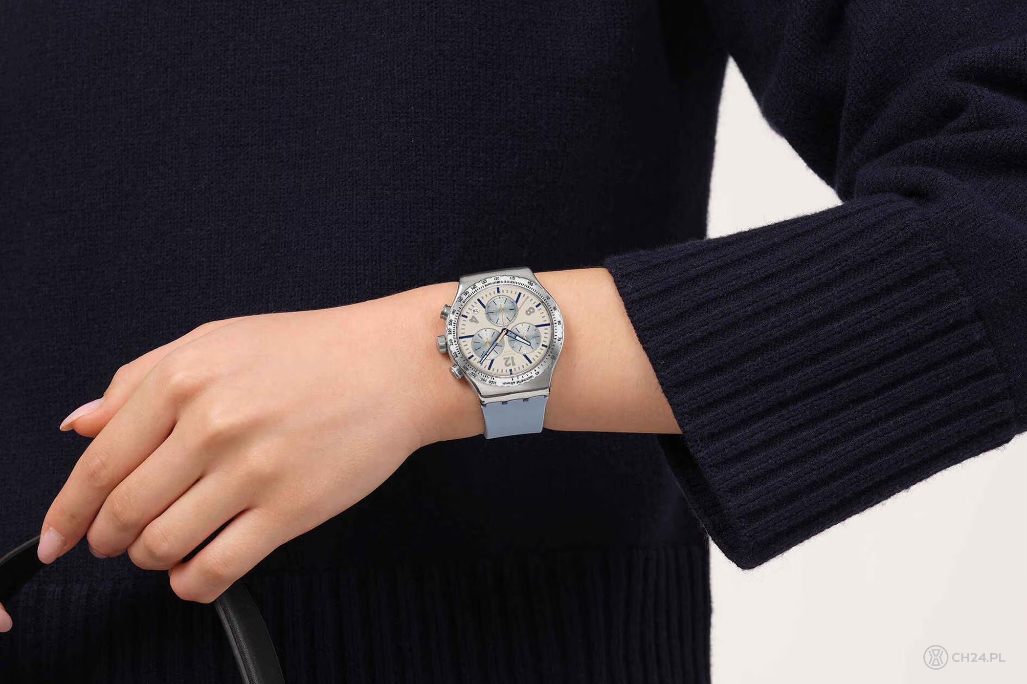 Ostatni ze wspomnianych modeli ze stoperem, Purple Glow, jest utrzymany w stylu sportowego szyku. Co prawda jego stalowa koperta wygląda tak samo i ma takie same wymiary, jak w trzech pozostałych wersjach (43 x 12,67 mm), ale w Purple Glow obudowa przechodzi w polerowaną, stalową bransoletę, która składa się z trzech rzędów ogniw. Oryginalnie prezentuje się też zmieniająca kolor tarcza (z ciemnoczerwonego na ciemnofioletowy) z podziałką minutową i licznikami zaznaczonymi fioletowym odcieniem, żółtymi podziałkami na licznikach, szarymi lub niebieskimi wskazówkami oraz różową wskazówką sekundową stopera. Kolorowy Purple Glow kosztuje 1020 PLN.