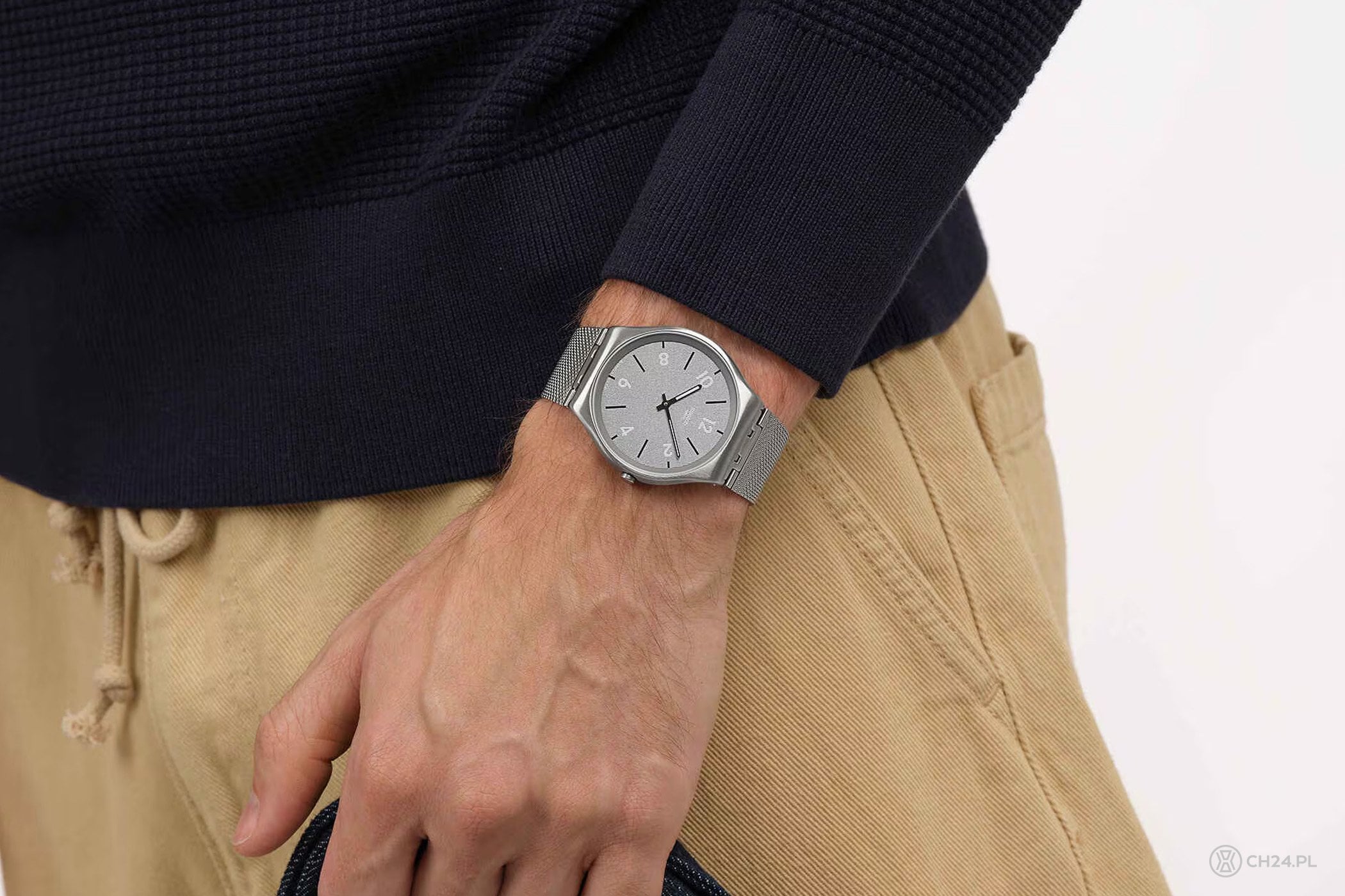 Osoby, dla których Purple Glow jest zbyt kolorowy, mogą wybrać prawie monochromatyczny Getting Meshy (cena: 950 PLN). Jego stalowa koperta ma średnicę 42 mm (wysokość tylko: 6,70 mm), jest wykończona szczotkowaniem i dobrze prezentuje się z modną, stalową bransoletą milanaise. W tym samym stylu jest utrzymana, srebrzysta matowa tarcza, na której widać dwie ciemnobordowe wskazówki (są częściowo pokryte masą świecącą), ciemnobordowe indeksy godzinowe oraz białe, arabskie cyfry.