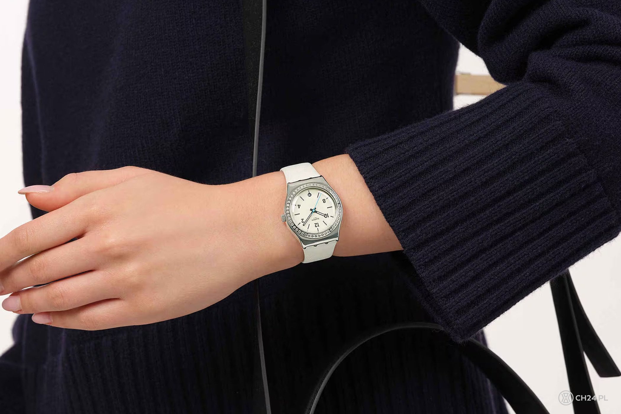 I na koniec, utrzymany w chłodnych odcieniach bieli i szarości Glacial Petals (cena: 590 PLN), którego błyszcząca, stalowa koperta ma pierścień ozdobiony kryształkami. Do srebrno-szarej obudowy i bieli kryształków, została dopasowana jasna tarcza w kolorze kości słoniowej oraz biały, skórzany pasek. Glacial Petals ma takie same funkcje, jak Heart of Burgundy i Essence of Rose, lecz w tym modelu wskazówki, arabskie cyfry, indeksy godzinowe i datownik są w kolorze czarnym (oprócz kontrastowej, jasnoniebieskiej wskazówki sekundowej).