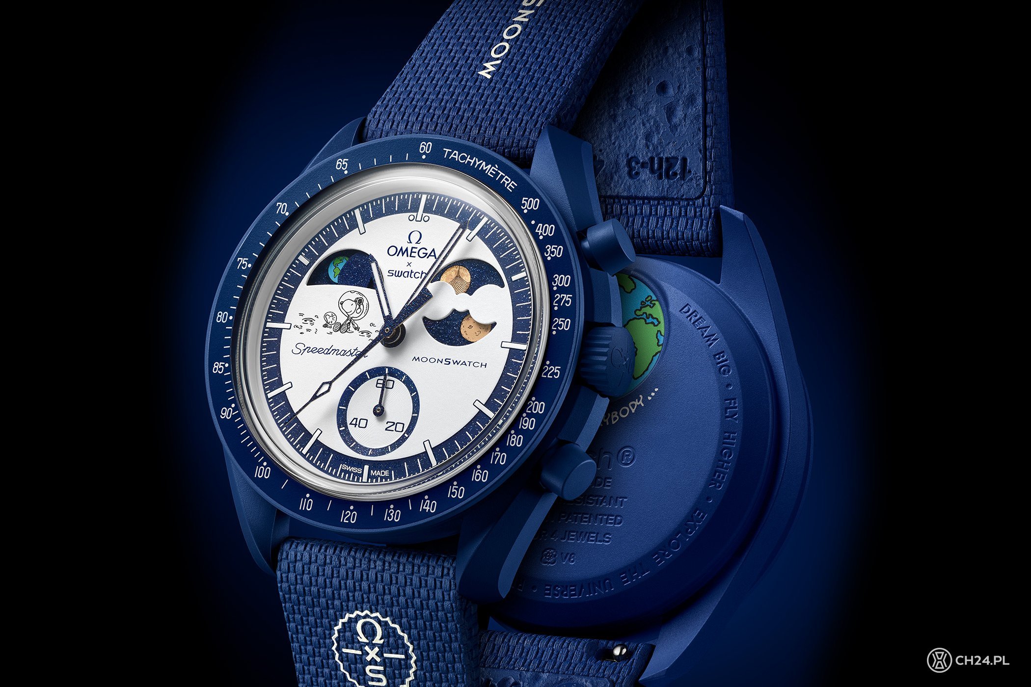 Domyślamy się więc, że Snoopy i Woodstock znajdują się na powierzchni Księżyca i stamtąd obserwują Ziemię otoczoną przestrzenią kosmiczną, którą symbolicznie tworzą: zrobiona z bioceramiki, ciemnoniebieska koperta (średnica 42 mm) z pierścieniem, na którym widać białą skalę tachometryczną, granatowy pierścień wokół tarczy z białą podziałką minutową, pierścień wokół małego sekundnika na godz. 6., a także dyski faz Księżyca i faz Ziemi oraz wskazówki. Wszystkie wymienione elementy (poza kopertą) mają wykończenie przypominające błyszczący awenturyn, kojarzący się z rozgwieżdżonym niebem.