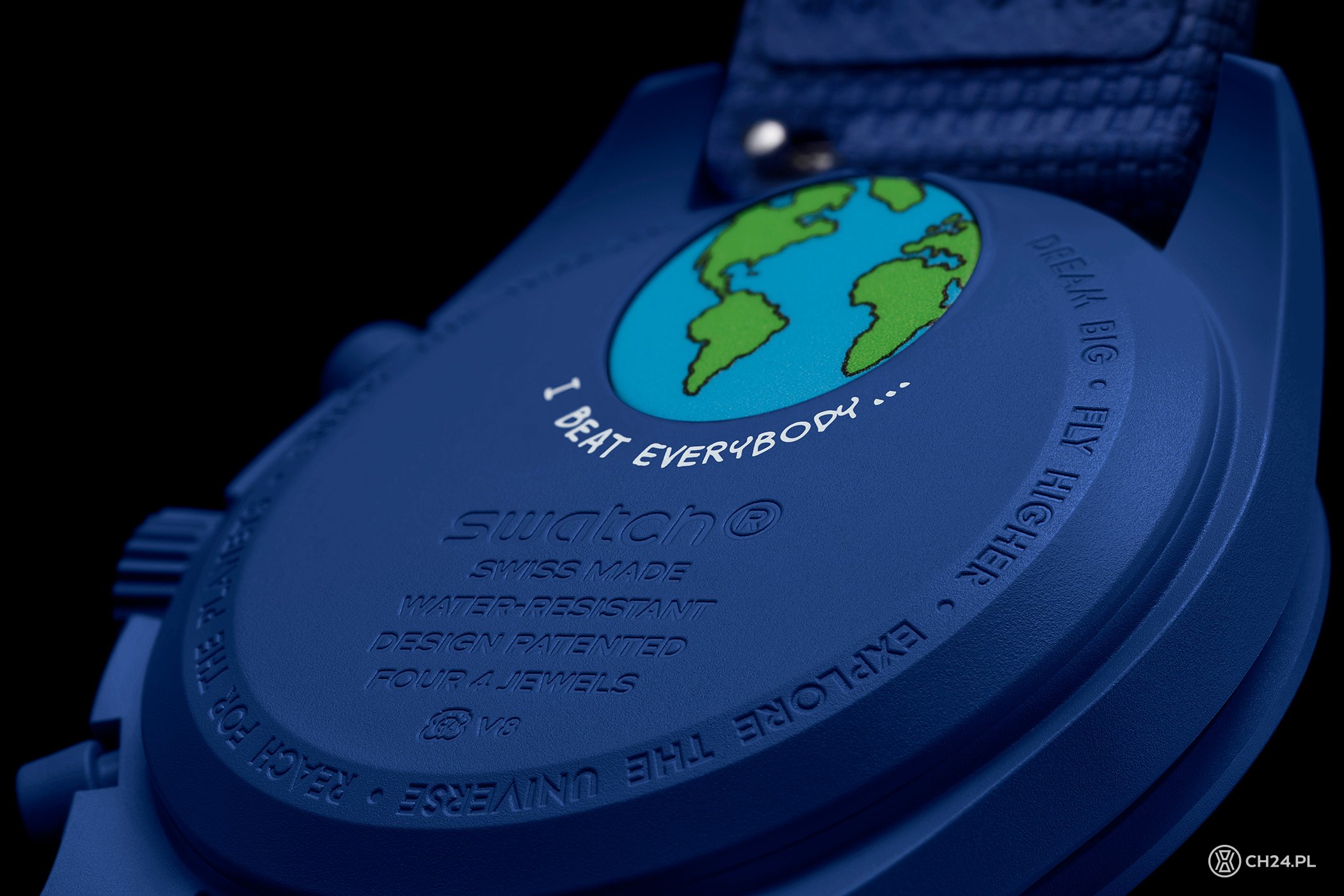 Podobnie jak wszystkie zegarki z tej serii, także i ten ma mechanizm kwarcowy. Na deklu widać więc charakterystyczną osłonę baterii, która w tej wersji ma nadrukowany wizerunek Ziemi z kontynentami zaznaczonymi zielonym, a oceanami niebieskim kolorem. Nowością jest nadrukowany pod motywem Ziemi, biały napis „I beat everybody…”, tj. identyczny, jak ten na tarczy (po raz pierwszy w MoonSwatchu na tarczy i na deklu mamy ten sam tekst).