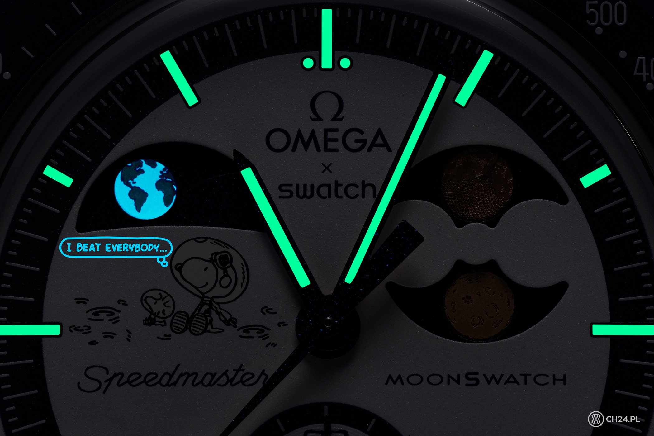 Zacznijmy od Snoppy’ego: nowość polega na tym, że po raz pierwszy, postacie Snoopy’ego i Woodstocka są nadrukowane na tarczy, a nie na dysku z dwoma księżycami. Tym razem słynny beagle i jego przyjaciel wpatrują się w obracający się dysk ze wskazaniami faz Ziemi na godz. 10. W świetle UV obraz jest uzupełniony świecącym w kolorze niebieskim napisem: „I beat everybody…”, który jest fragmentem zdania: „I beat the Russians… I beat everybody…” „ („Pokonałem Rosjan… Pokonałem wszystkich…”). Ta wypowiedź pochodzi z komiksu „Fistaszki ”, w którym Snoopy wyobraża sobie siebie jako pierwszego beagla lądującego na Księżycu i triumfalnie ogłasza swoje zwycięstwo w wyścigu kosmicznym.