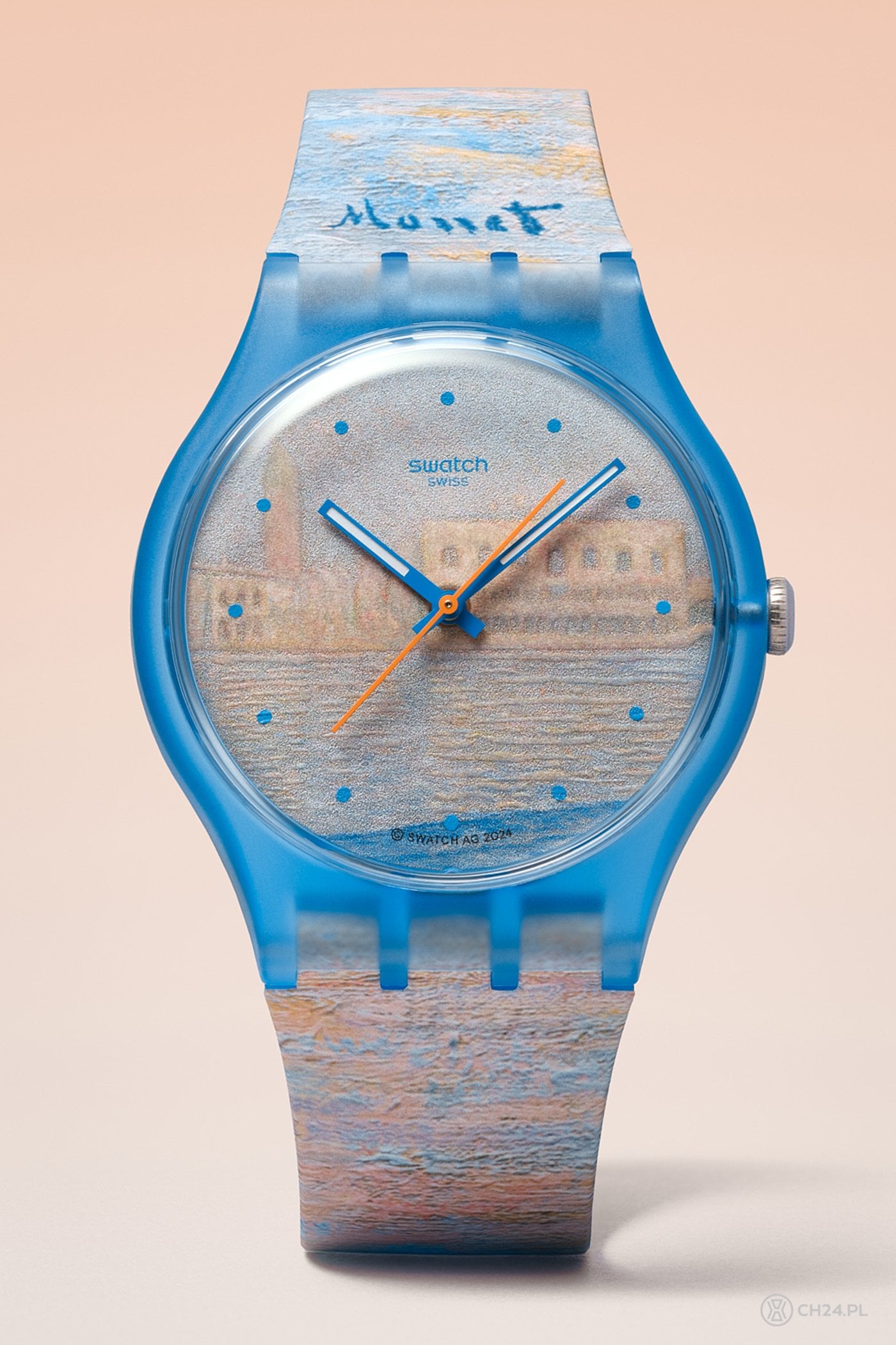 Kolejny zegarek to kolejne arcydzieło: Monet’s Palazzo Ducale (cena: 475 PLN) jest inspirowany obrazem „Pałac Dożów” Claude’a Moneta (1908) i przedstawia majestatyczny, wenecki pałac, który jest jednym z symboli tego miasta. Ten model ma większą, bo 41-milimetrową kopertę w kolorze niebieskim. Na jego tarczy widać delikatne, niebieskie indeksy, a pod nimi – odbijającą się w wodzie i oświetloną fioletowo-różowym światłem, fasadę budynku z charakterystycznymi gotyckimi arkadami. Z kolei pasek ukazuje zmieniające się refleksy weneckiej laguny (w ten sposób nawiązano do zdolności Moneta do uchwycenia światła). Ciekawostką jest podświetlenie tarczy widoczne w ciemności (wtedy rozświetla ją pomarańczowa poświata). Monet’s Palazzo Ducale jest też dostępny w wersji Monet’s Palazzo Ducale PAY!, czyli z funkcją SwatchPAY!, umożliwiającą bezpieczne płatności.