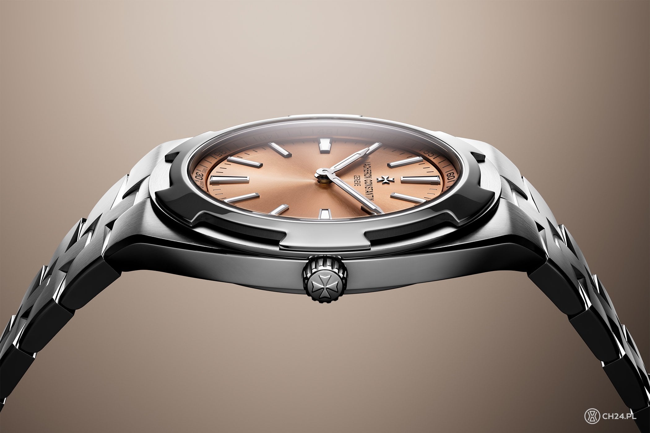 Z kolei tarcza nowego modelu – prosta i minimalistyczna jak na ultrapłaski zegarek przystało – otrzymała efektowny odcień łososiowego, podkreślony szlifem słonecznym i otoczony pierścieniem z podziałką minutową i matowym finiszem. Na cyferblat nałożono proste indeksy godzinowe, a czas odmierza para dwóch równie prostych w formie wskazówek, wypełnionych luminową. Miejsce na godz. 12 zajmuje nałożone logo Vacheron Constantin.
