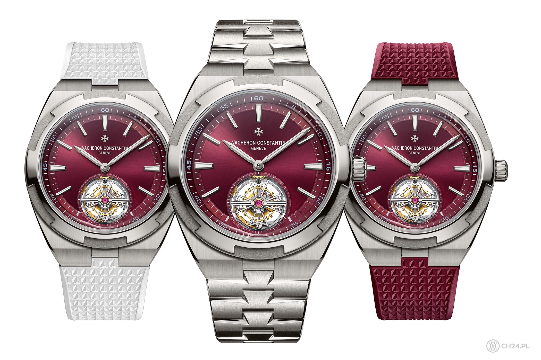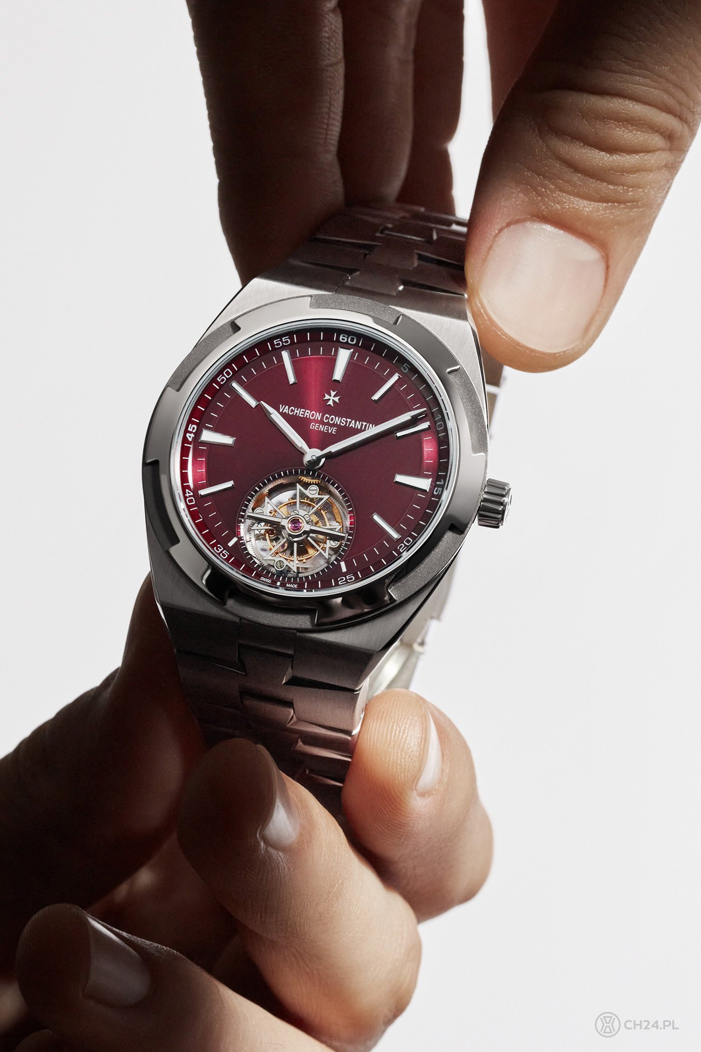Casualowo-sportowy model Overseas debiutuje w wariancie łączącym tytanową kopertę z rzadko spotykaną, czerwoną tarczą oraz widocznym w jej dolnej części tourbillonem.
