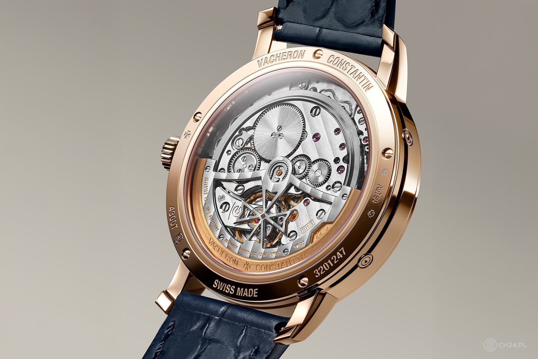 Sercem Traditionnelle Perpetual Calendar Ultra-Thin jest, widoczny pod szklanym deklem, płaski kaliber 1120 QP z automatycznym naciągiem, który składa się z 276 części i ma 40-godzinną rezerwę chodu (balans pracuje w nim z częstotliwością 19 800 wahnięć na godzinę, czyli 2,75 Hz). Wśród wyrafinowanych detali jest ażurowy wahnik, ozdobiony Krzyżem Maltańskim i z zewnętrzną krawędzią zrobioną z 22-karatowego złota. Podobnie jak w przypadku wszystkich zegarków VC, poziom wykończenia został potwierdzony Pieczęcią Genewską.