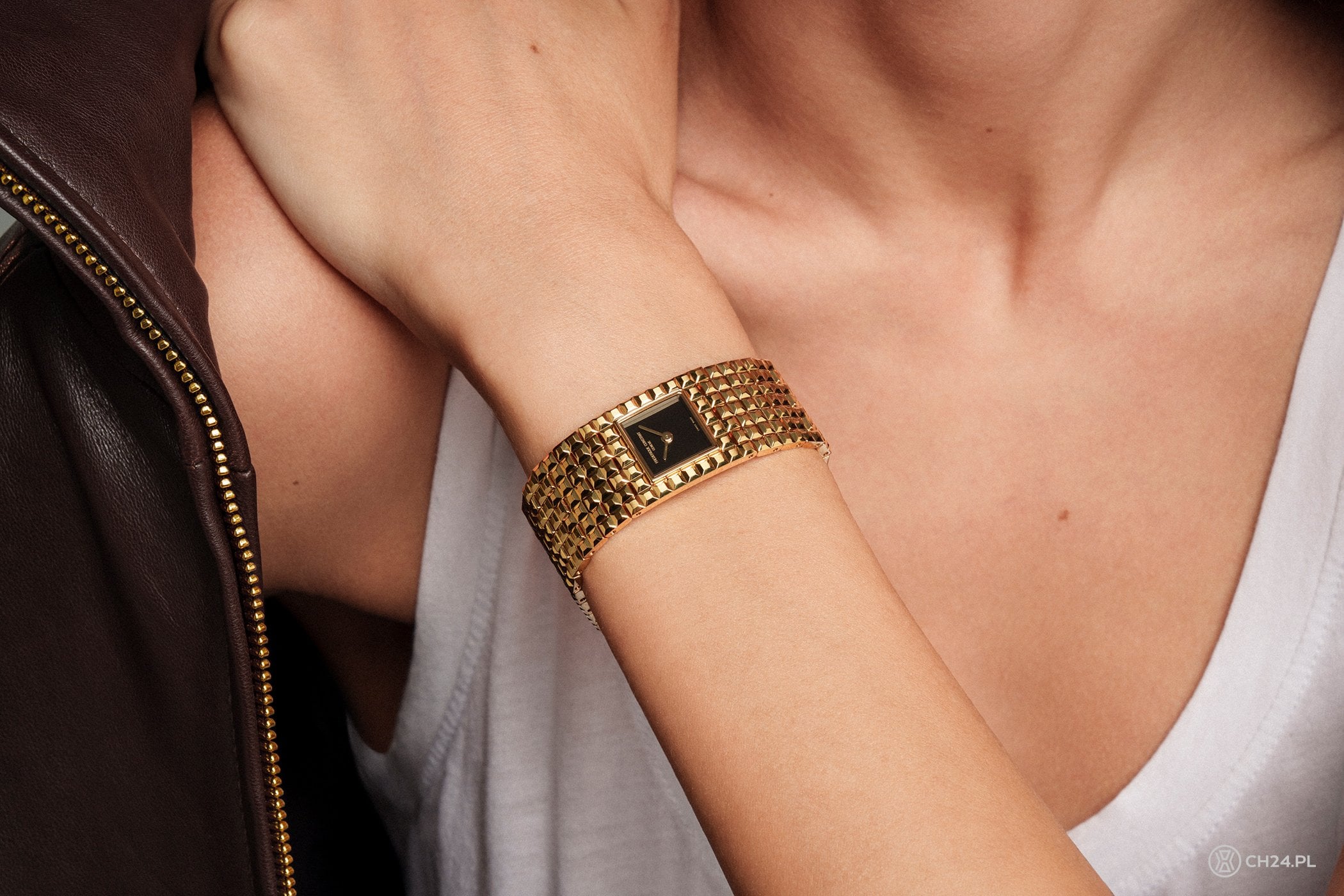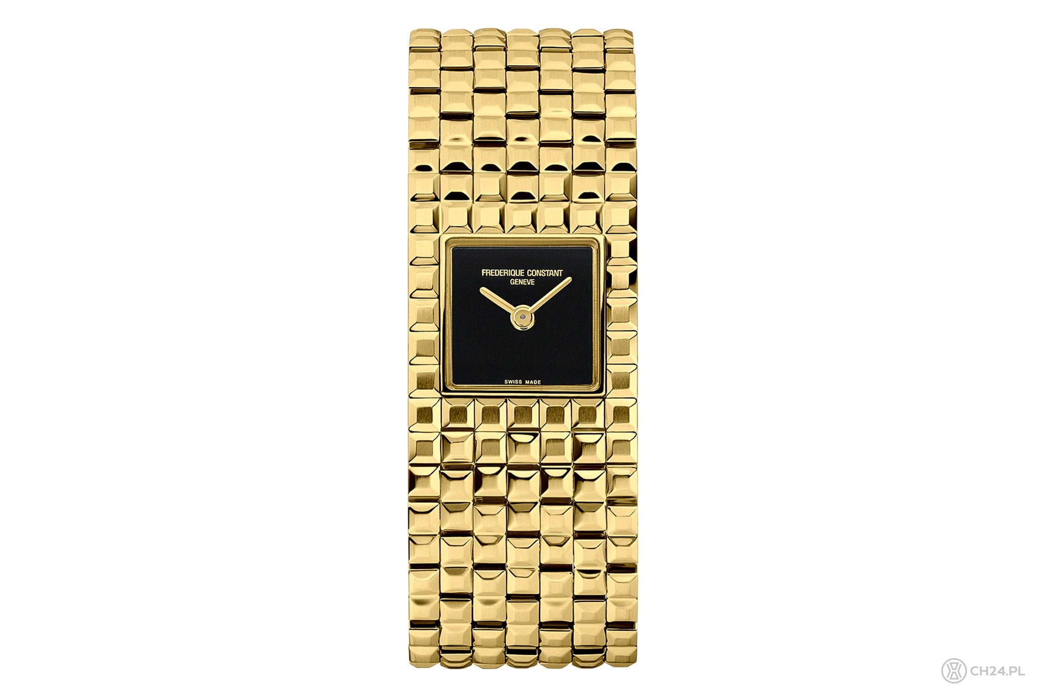 I to właśnie bransoleta jest najważniejszym elementem każdego modelu z tej linii, ponieważ wkomponowany w nią zegarek stanowi jedynie atrakcyjny dodatek. Tak jest też w przypadku najnowszej wersji modelu Classic Manchette, oferowanej z przestrzenną bransoletą, składającą się z siedmiu rzędów kwadratowych ogniw, ozdobionych słynnym wzorem Clou de Paris. Z tym, że tutaj, ogniwa zostały pokryte powłoką PVD w kolorze żółtego złota, więc zegarek prezentuje się bardziej ekskluzywnie.